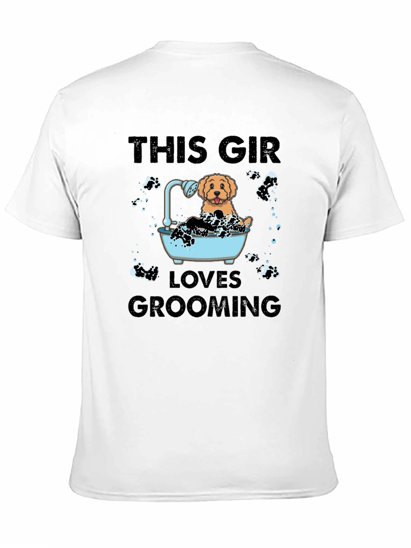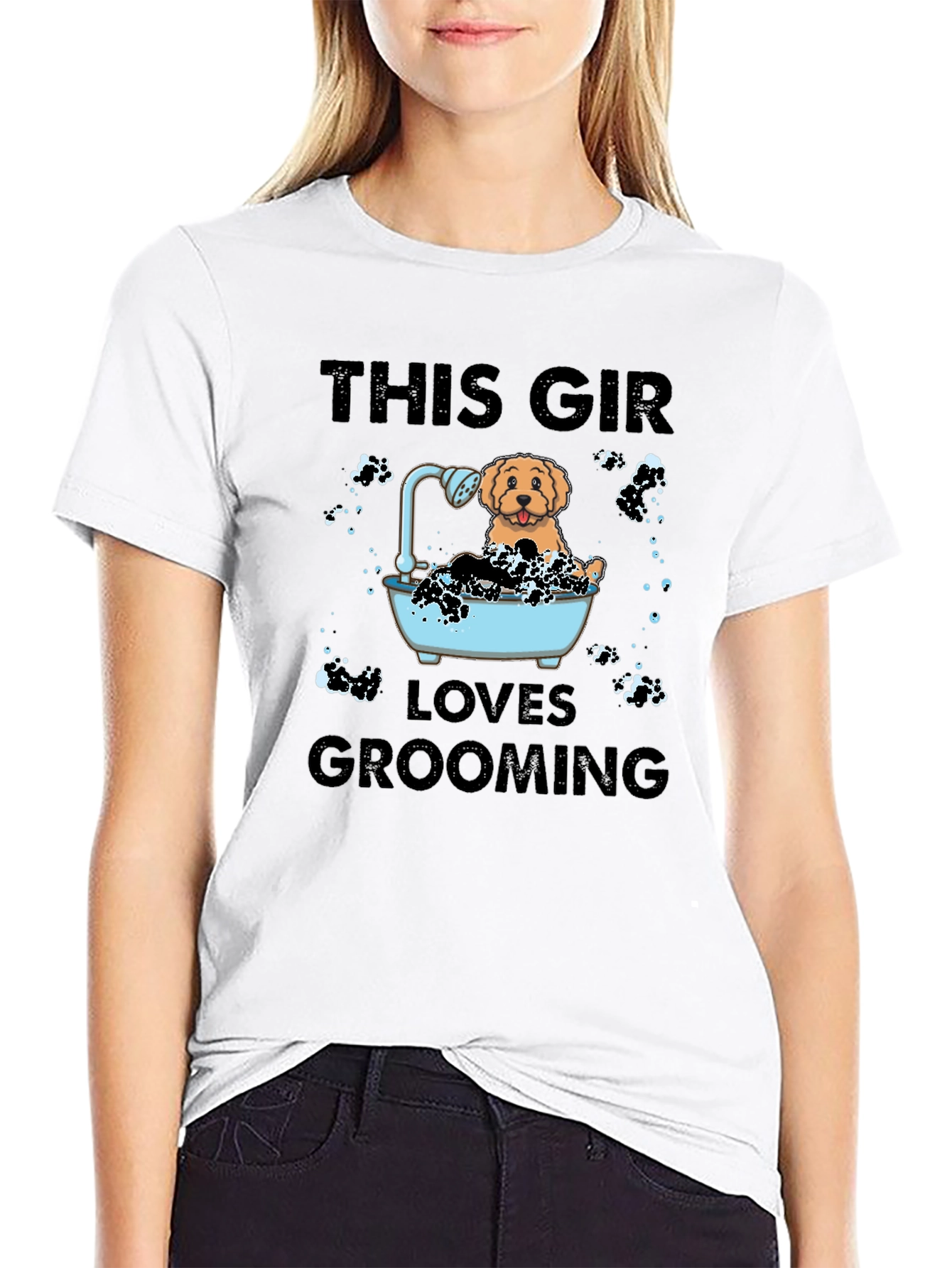 Show off your love for grooming with this adorable black T-shirt! This fun tee features a cute dog enjoying a bubbly bath, complete with a showerhead and playful soap bubbles. The bold text "THIS GIR LOVES GROOMING" adds a touch of charm. Perfect for groomers, dog lovers, or anyone who appreciates a clean pup! Made from a comfortable-looking fabric, this T-shirt is ideal for casual wear, grooming appointments, or lounging at home with your furry friend. Get yours today and spread the grooming love!