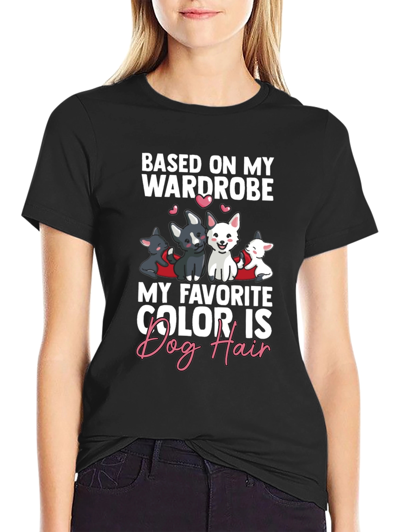 Show your love for your furry friends with this charming black t-shirt! Featuring a playful design that reads "Based on My Wardrobe My Favorite Color Is Dog Hair," this tee is perfect for any dog owner with a sense of humor. The design includes cute cartoon dogs. Made from a soft, breathable fabric, this shirt ensures comfort all day long. Wear it while walking your dog, lounging at home, or hanging out with fellow dog lovers. It's a must-have addition to any dog parent's wardrobe!