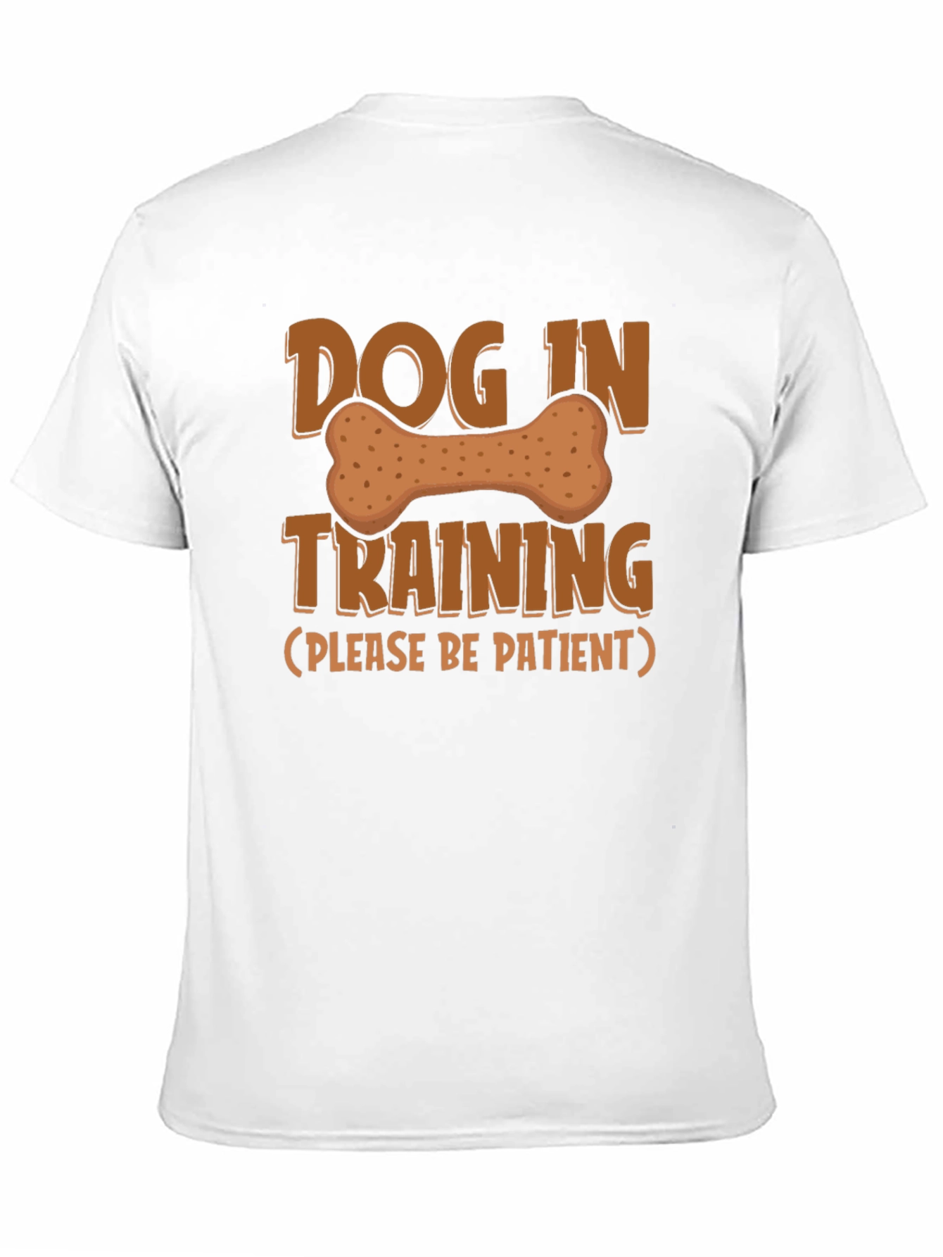 This black t-shirt features a playful design perfect for dog lovers and trainers. The phrase "DOG IN TRAINING (PLEASE BE PATIENT)" is displayed prominently in a tan, cartoonish font. A dog bone graphic appears between the words 'DOG' and 'TRAINING'. Made from a comfortable cotton blend, this shirt is soft, breathable, and ideal for everyday wear. Show off your love for your furry friend or gift it to someone in the dog training community. A fun and lighthearted tee for casual outings and training sessions.