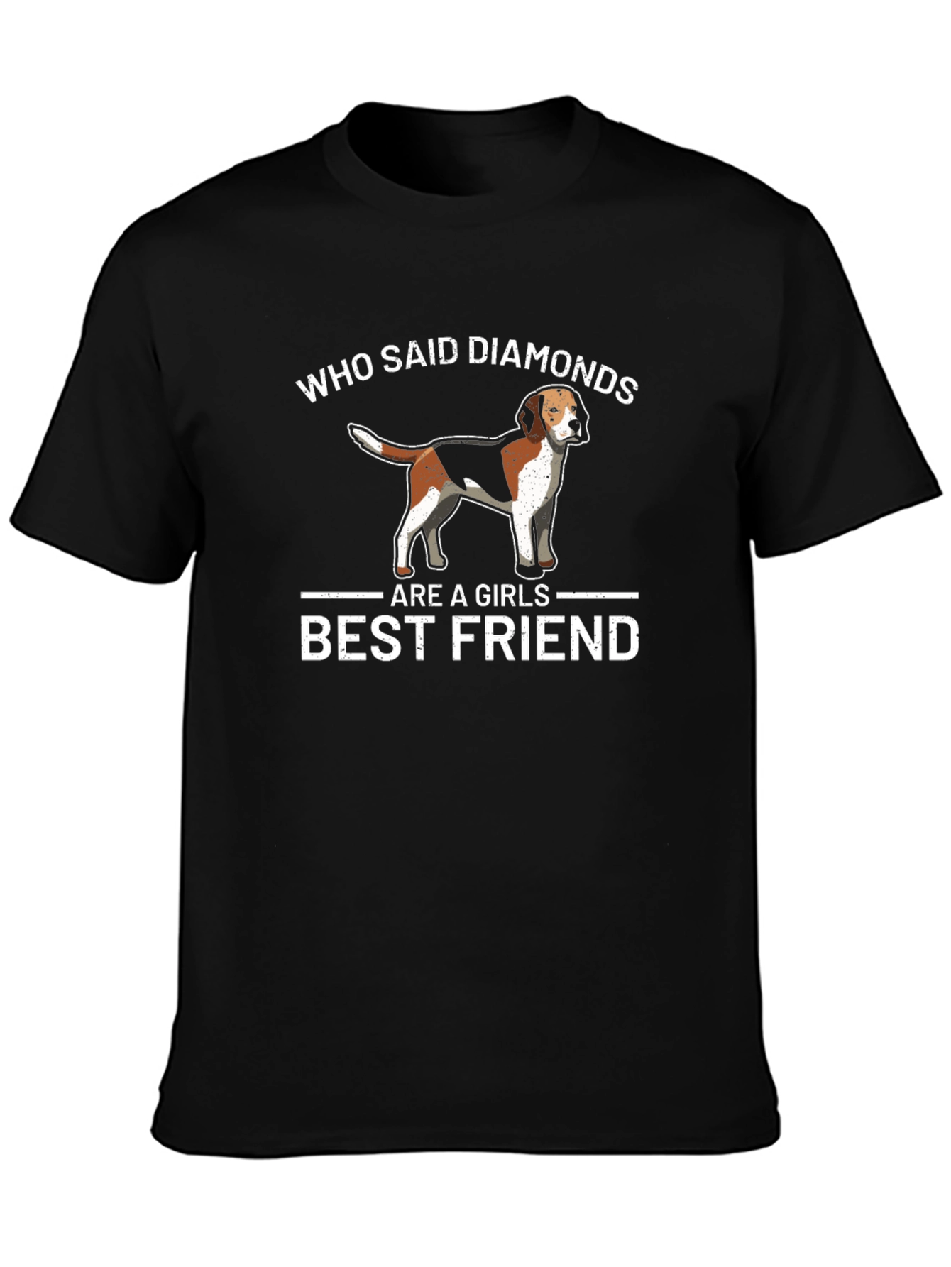 This black t-shirt features a cute dog graphic, perfect for animal lovers. The design includes the text "WHO SAID DIAMONDS ARE A GIRLS BEST FRIEND" showcasing a playful take on traditional sayings. Made from comfortable material, this shirt is ideal for everyday wear. Show off your love for dogs with this stylish and humorous t-shirt. It's a great conversation starter and makes a thoughtful gift for dog owners and enthusiasts. Pair it with jeans or shorts for a casual look that expresses your unique personality.
