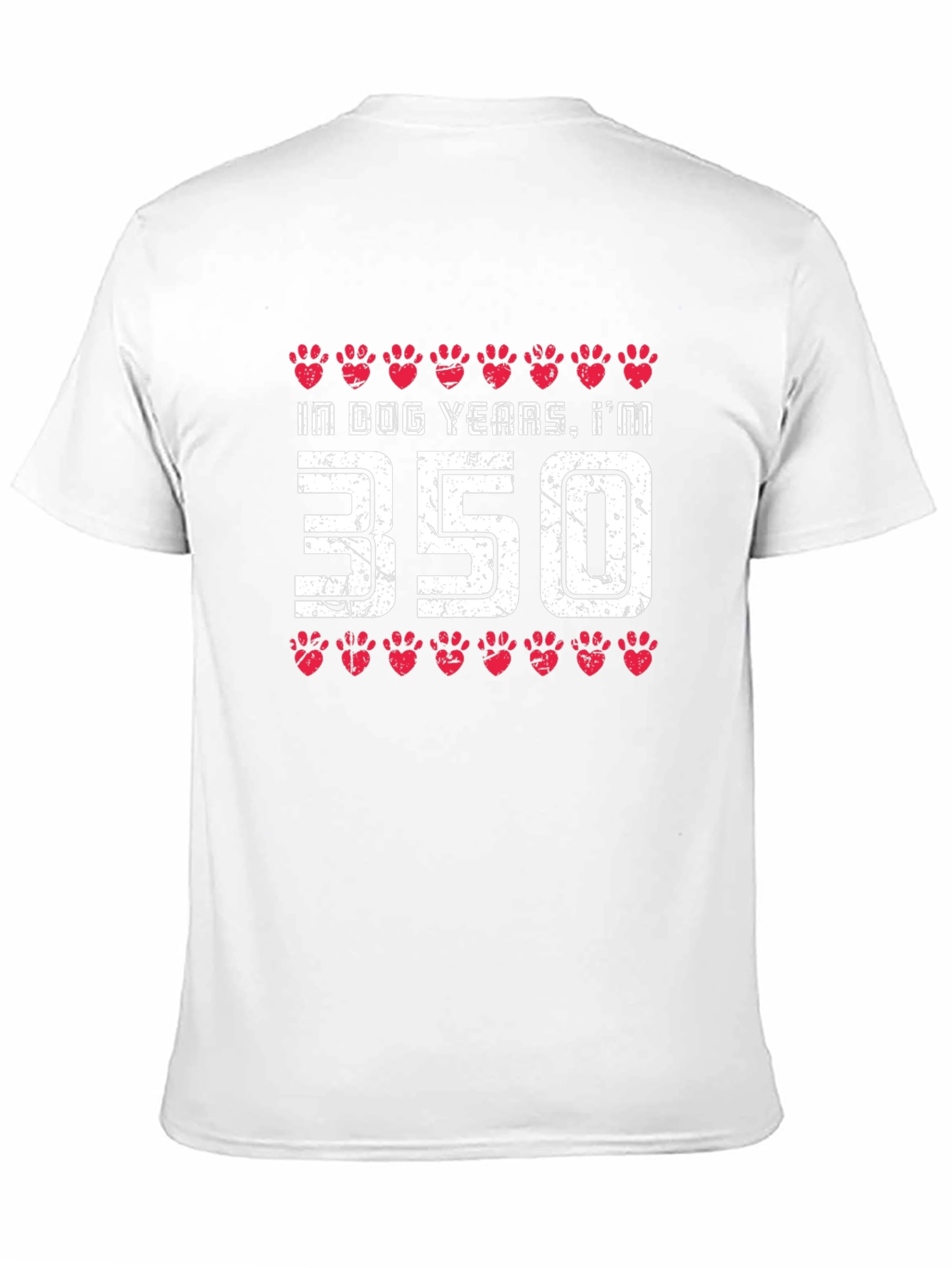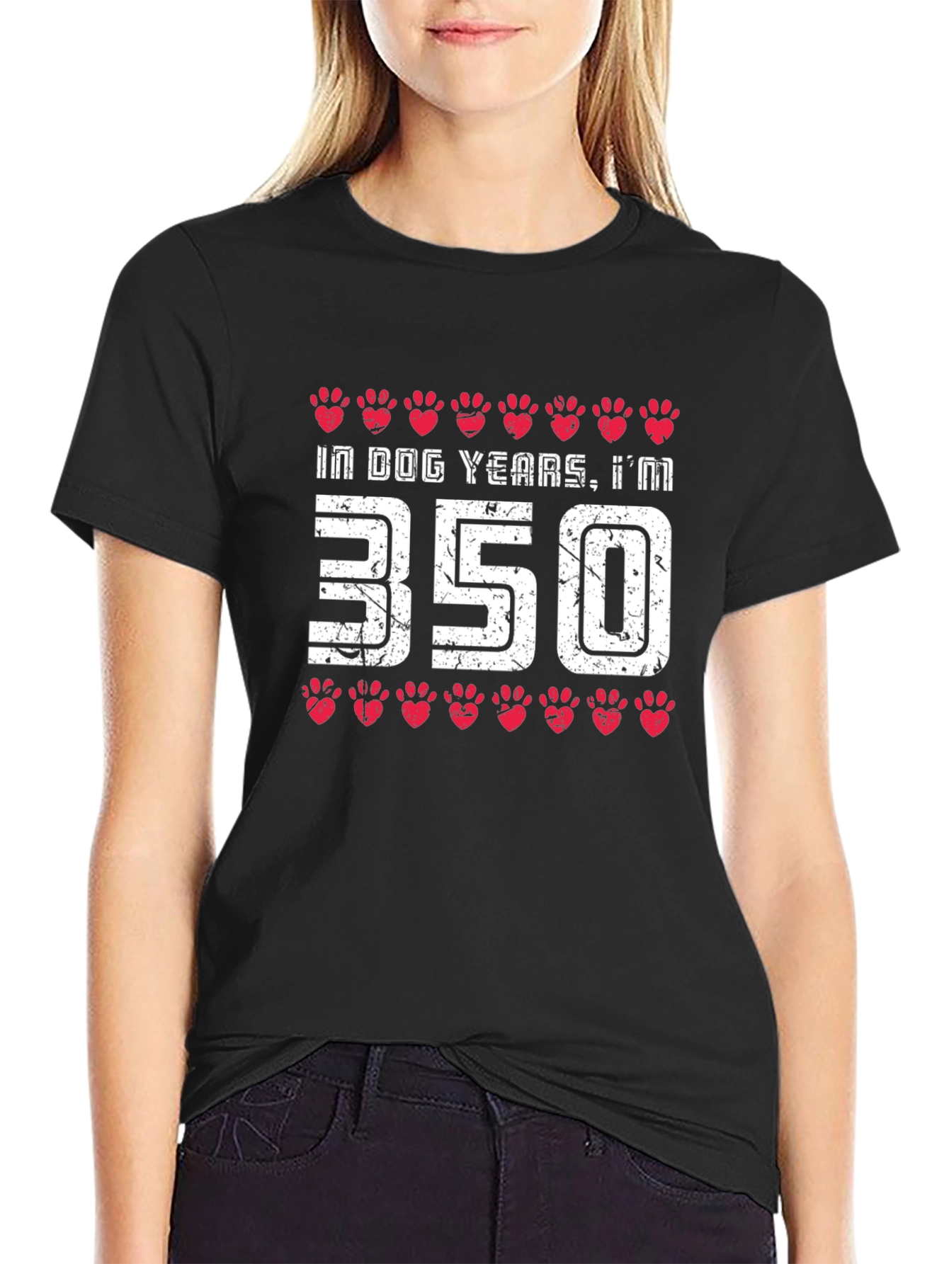 This unique black t-shirt features a fun and playful design. The graphic on the front reads "In Dog Years, I'm 350" with red paw print accents above and below the text. The distressed, vintage style font adds a touch of retro charm to the design. Made from a comfortable, breathable fabric, this tee is perfect for casual wear. Show off your sense of humor and love for dogs with this eye-catching shirt. It's a great conversation starter and a must-have for any dog lover's wardrobe. Wear it to the park, a casual outing, or simply while lounging at home.