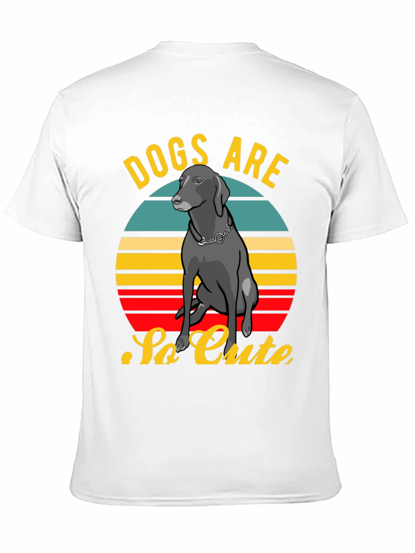 This black t-shirt features a delightful design centered around a charming grey dog. The graphic is set against a retro-style circular backdrop with teal, yellow, and red horizontal stripes. The phrase "DOGS ARE So Cute" arches above and below the design, adding a playful touch. Made from a comfortable-looking fabric, this tee appears to be an excellent choice for casual wear. Perfect for dog lovers who appreciate vintage aesthetics. Show off your love for dogs in style with this unique and eye-catching t-shirt!