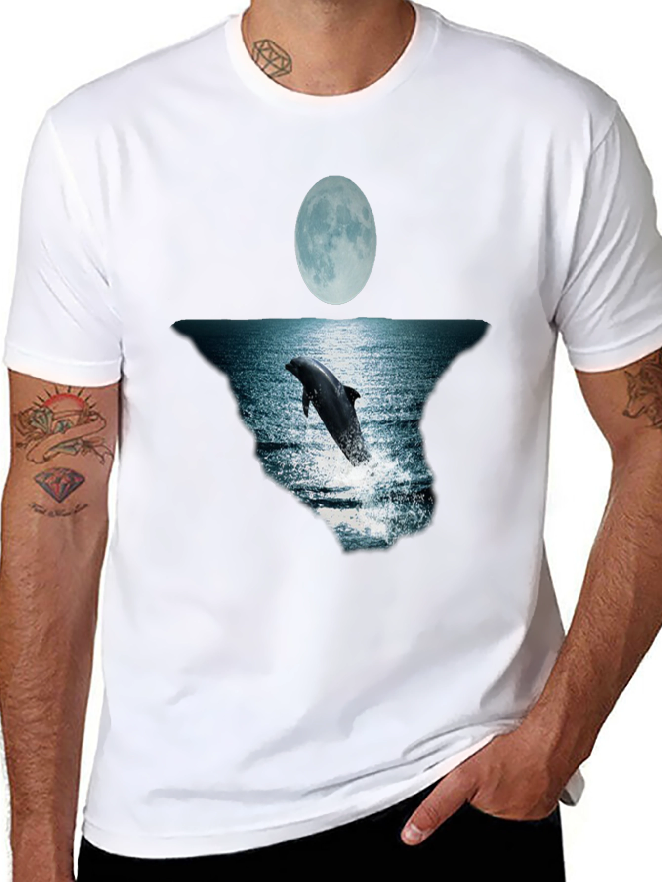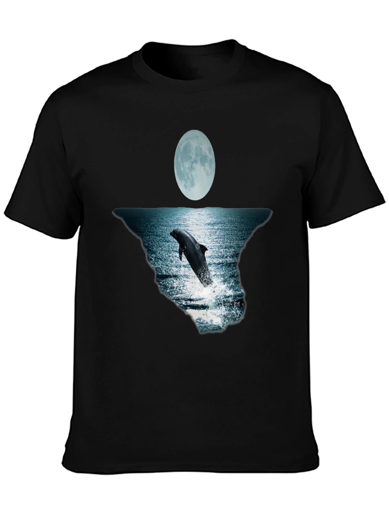 Dive into style with this striking black tee, featuring a captivating graphic print. A sleek dolphin leaps from ocean waves beneath a glowing full moon, creating a mesmerizing design. Crafted from comfortable cotton, this t-shirt offers a relaxed fit for everyday wear. The vivid image is printed clearly, making a bold statement. Perfect for casual outings, beach days, or anyone who loves marine life. A unique addition to your wardrobe, this dolphin moon tee effortlessly combines comfort and eye-catching design.