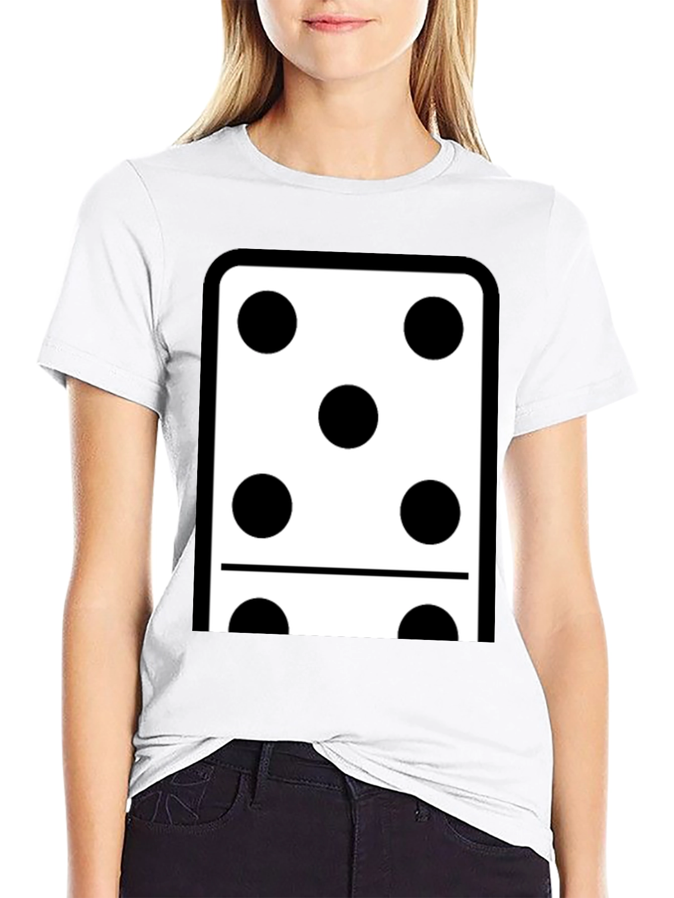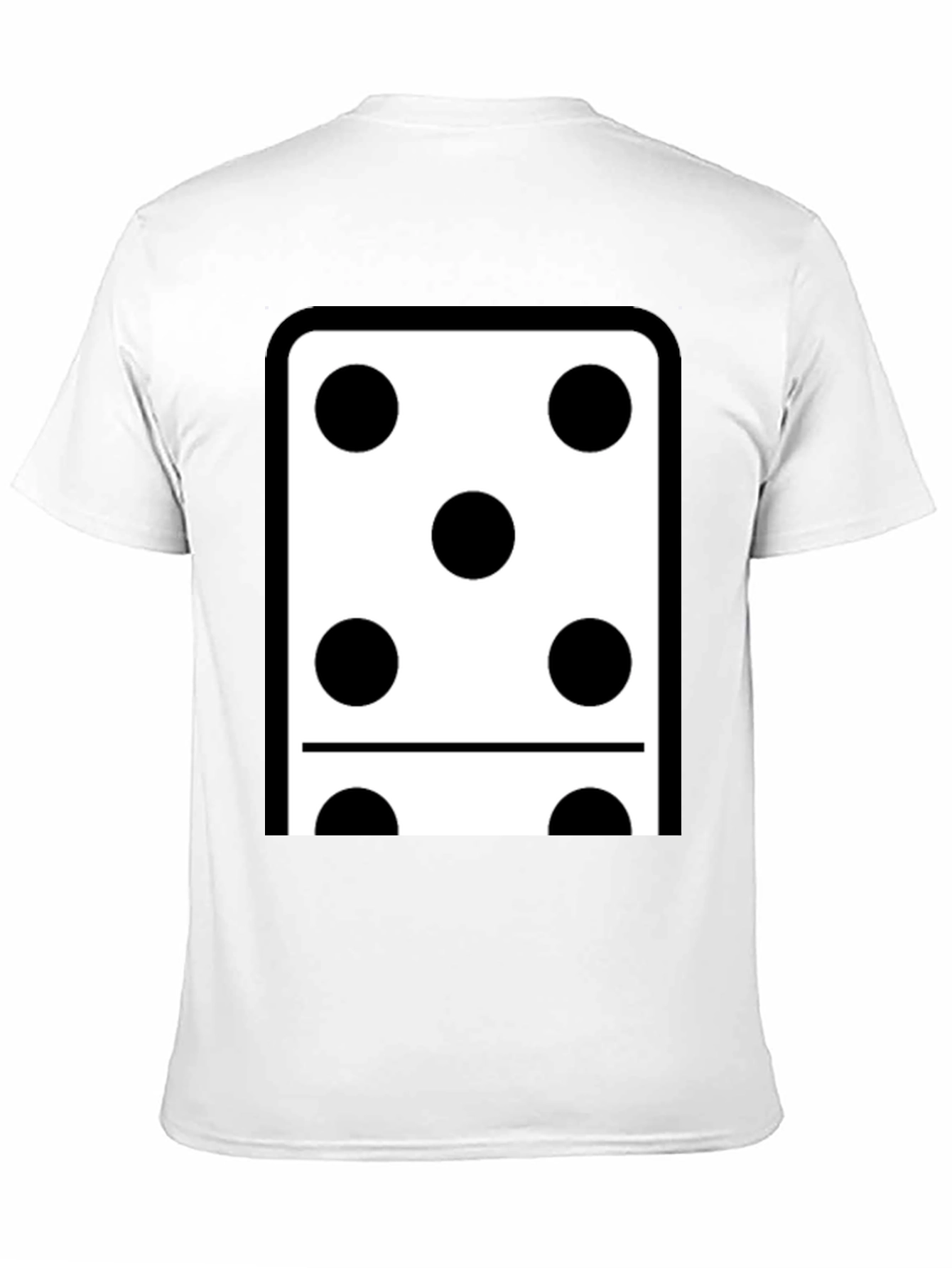 Showcase your love for classic games with this unique t-shirt. This black tee features a bold domino design. The domino shows five dots above and one dot below, creating a six total. The design is crisp and clean. Made from comfortable materials, this tee is perfect for casual wear or game nights. It's a great way to express your personality and add a touch of fun to your everyday style. Ideal for domino enthusiasts and anyone who appreciates eye-catching designs. Get yours today and roll the dice on style!