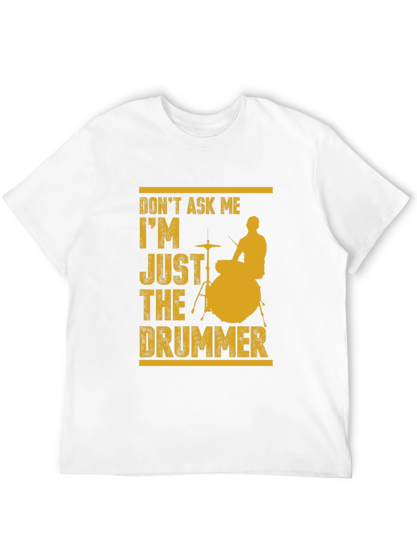 Show off your passion with this eye-catching black t-shirt featuring a bold "Don't Ask Me I'm Just The Drummer" graphic. The design showcases a drummer silhouette behind their kit, rendered in a striking gold color. Made from what appears to be a soft and breathable cotton blend, this tee offers both comfort and style. The classic crew neck and short sleeves make it a versatile addition to any casual wardrobe. Perfect for band practices, concerts, or everyday wear, this t-shirt is a must-have for any drummer or music enthusiast. Let the world know your role with this statement piece!