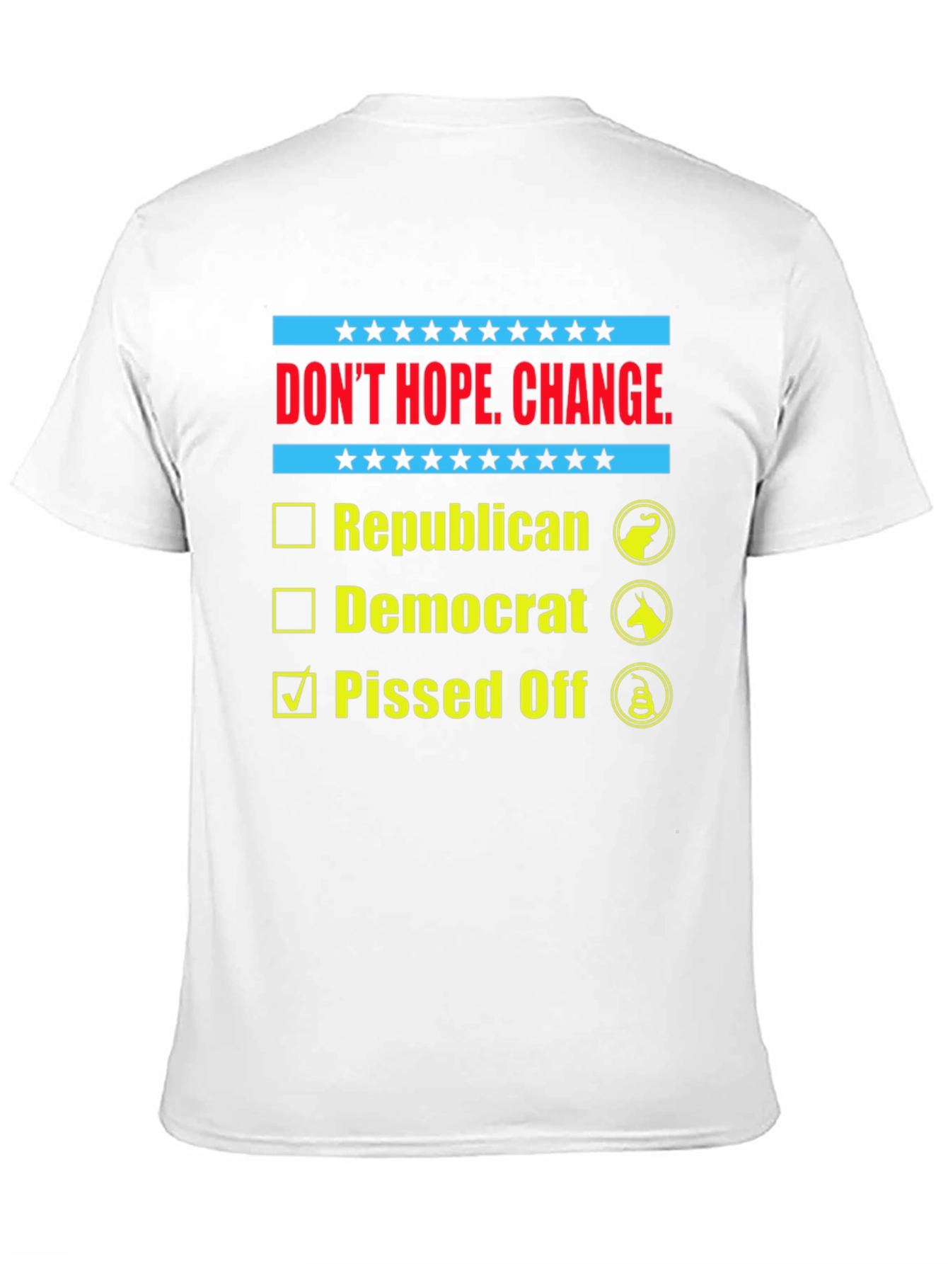 This black t-shirt features a bold political statement with the phrase "DON'T HOPE. CHANGE." printed in red, framed by blue stripes and stars. Below, checkboxes are labeled "Republican", "Democrat", and "Pissed Off", with the last box checked. Symbols representing an elephant, donkey, and Gadsden flag accompany the labels, respectively. Made from what appears to be a soft, comfortable cotton blend, this tee is perfect for expressing your political views with a touch of humor. Wear it to rallies, debates, or casual outings to spark conversation and make a statement. A must-have for anyone who's politically engaged!