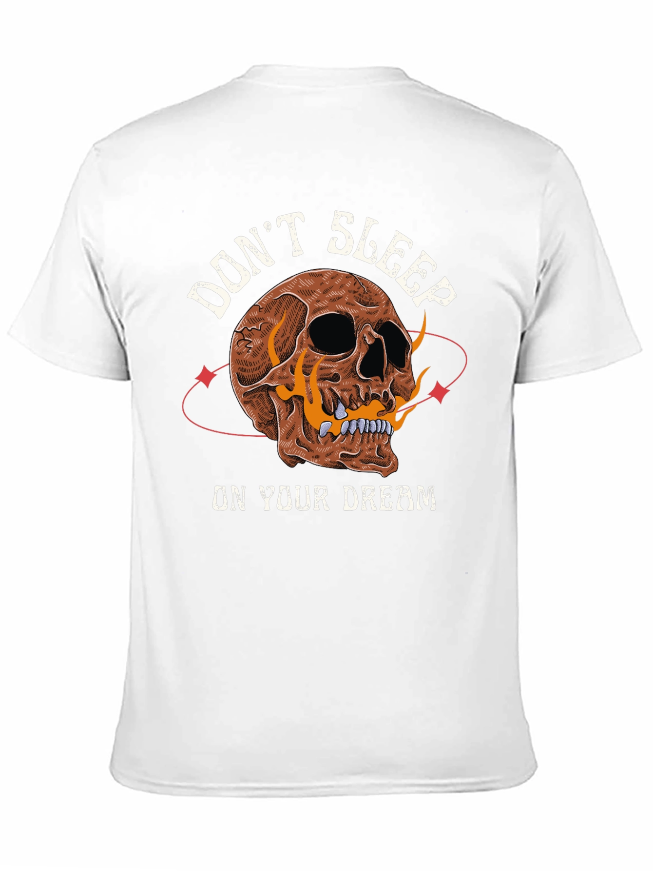 This striking black t-shirt features a captivating graphic design. A brown skull takes center stage, encircled by a red, starlit orbit. Fiery elements enhance the skull's dramatic appearance. Above and below the skull, the phrases 'DON'T SLEEP' and 'ON YOUR DREAM' are emblazoned in a clean, white font, adding an inspirational message to the edgy design. Made from comfortable material, this short-sleeved tee is perfect for casual wear. It's an ideal choice for those who appreciate unique graphic tees and want to express their ambition and drive through their clothing. Wear it to make a bold statement and remind yourself to pursue your goals relentlessly.