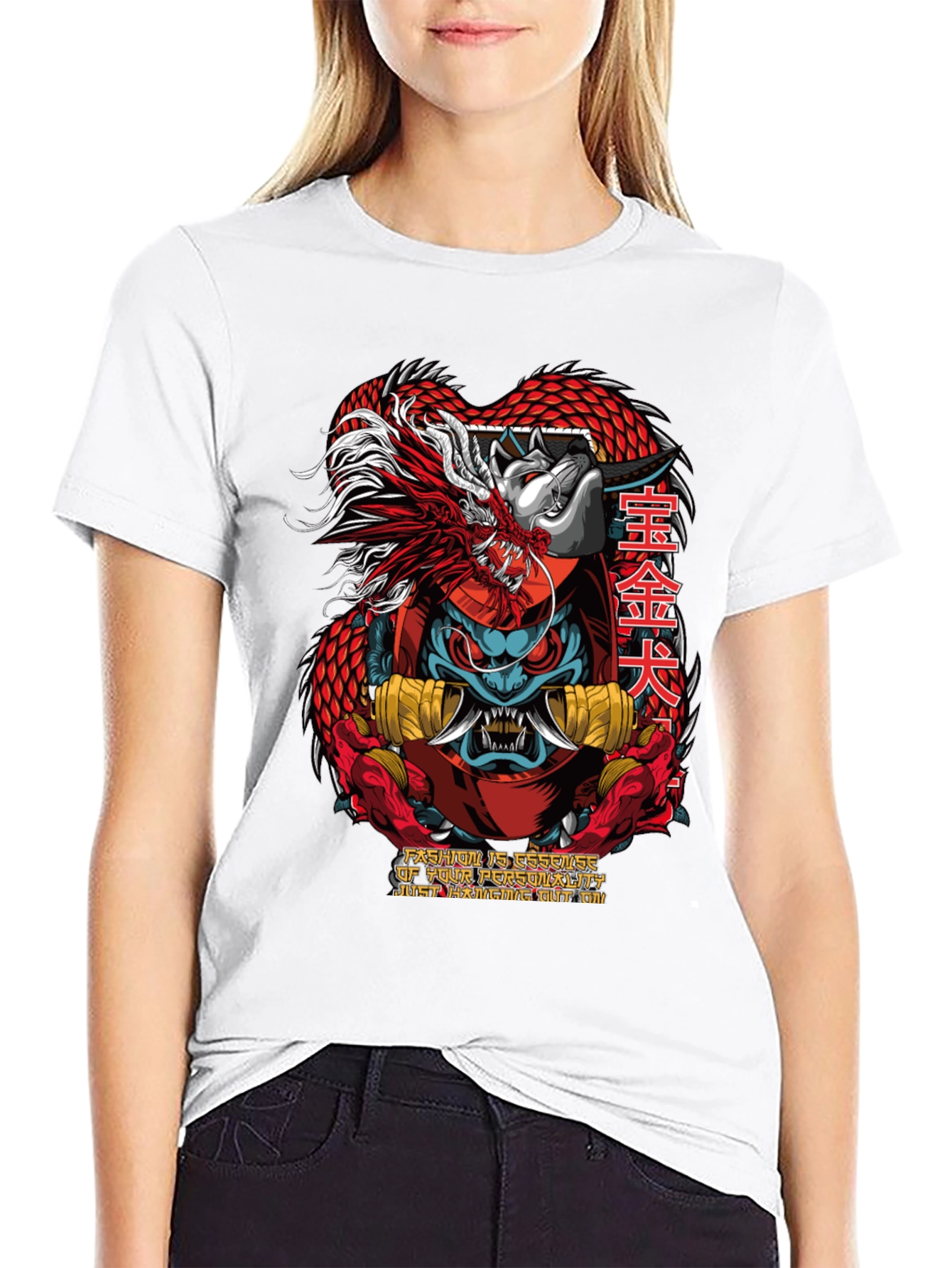 Rock a bold, eye-catching style with this black graphic t-shirt! Featuring a unique design of a snarling canine encompassed by a vibrant red and white dragon, this tee is sure to turn heads. The colorful artwork includes Japanese characters and a statement text for added flair. Made from a comfortable, breathable fabric, this shirt is perfect for everyday wear. Showcase your individuality and stand out from the crowd with this edgy graphic tee. Ideal for casual outings, concerts, or expressing your unique style. Grab yours today and unleash your inner dragon!