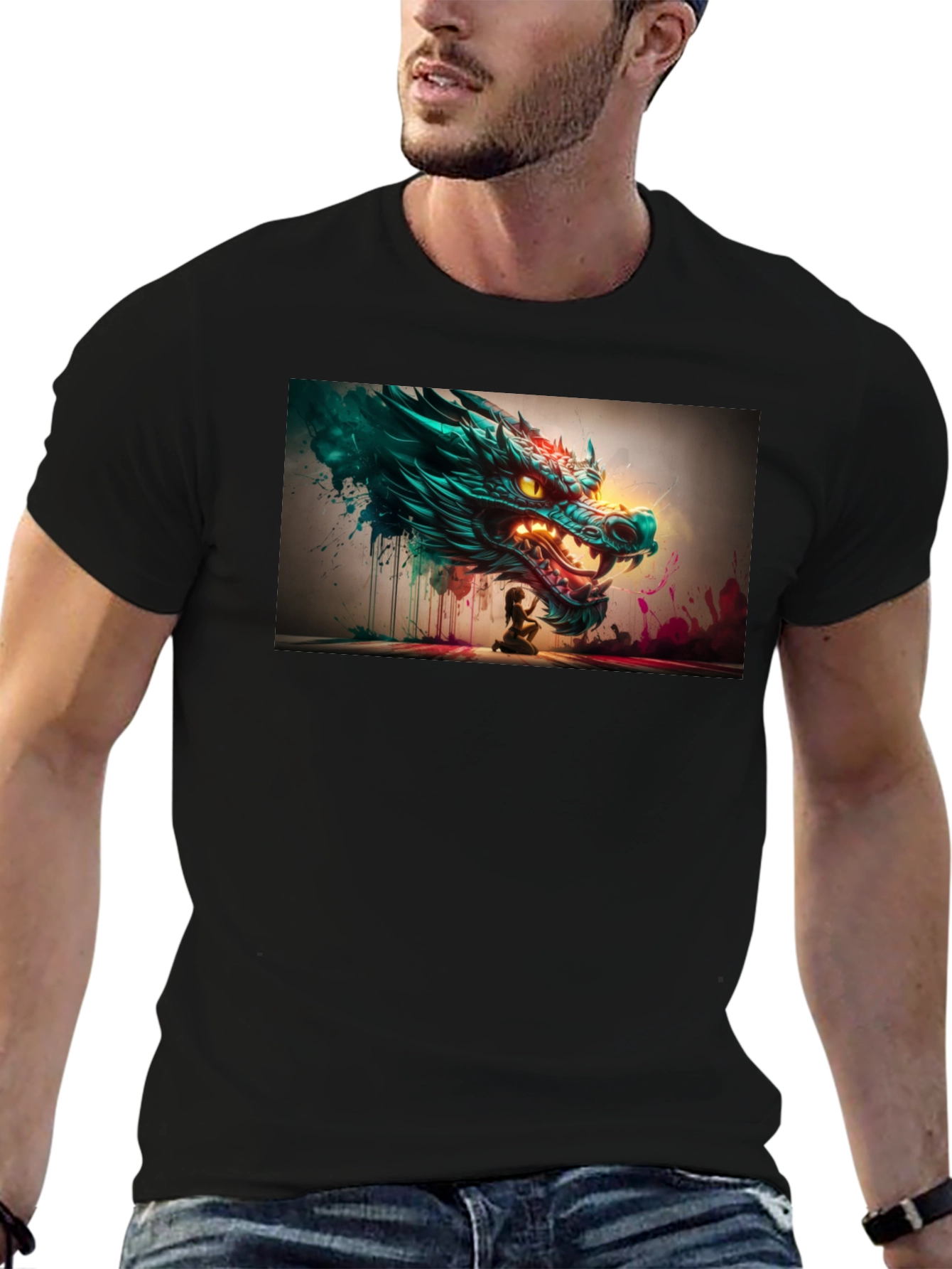 Showcase your unique style with this eye-catching black t-shirt featuring a vibrant, artistic dragon graphic. The intricate design boasts bold colors and dynamic details, creating a striking visual impact. Made from a comfortable, breathable fabric, this tee is perfect for everyday wear or a night out. The classic crew neck and short sleeves ensure a versatile fit that pairs well with jeans, shorts, or joggers. Whether you're a fan of fantasy art or simply want to make a statement, this dragon graphic tee is a must-have addition to your wardrobe. Stand out from the crowd and unleash your inner dragon with this stylish and comfortable t-shirt.