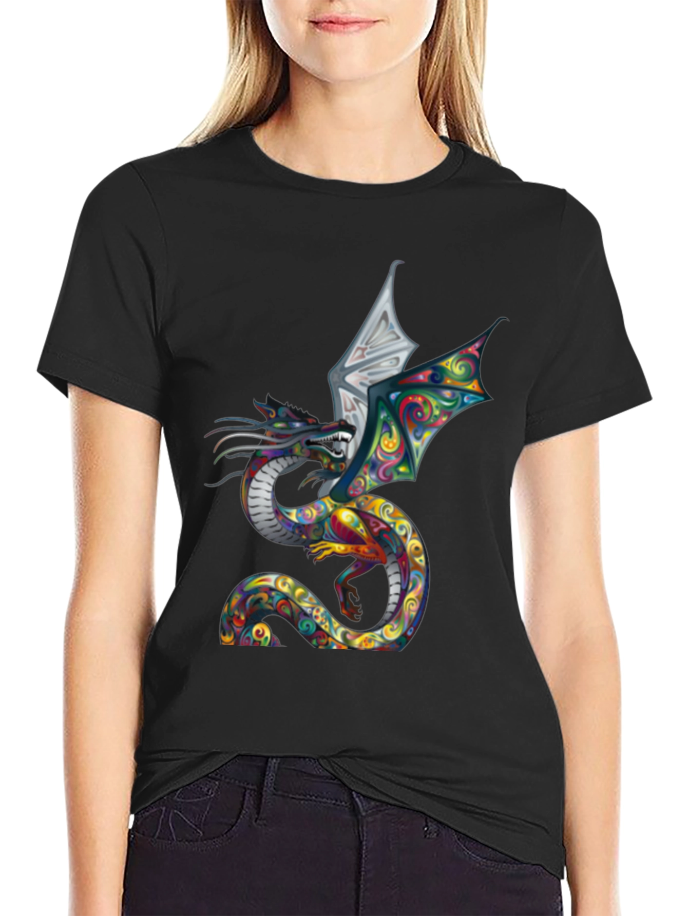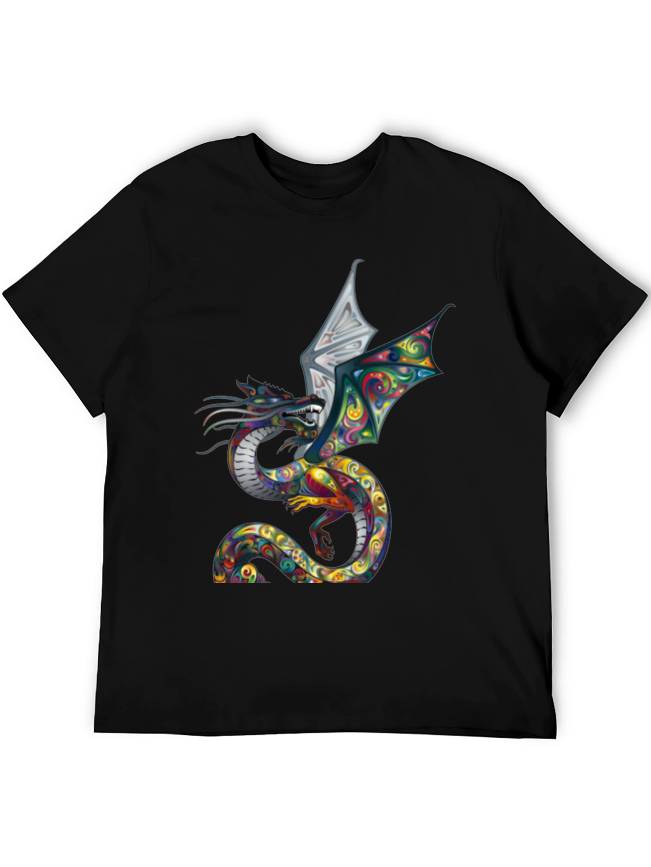 Unleash your inner mythical beast with this eye-catching graphic tee. Featuring a stunning, vibrantly colored dragon design, this shirt is sure to turn heads. The intricate detailing of the dragon, from its scales to its majestic wings, makes it a wearable work of art. Crafted from a comfortable, breathable fabric, this tee is perfect for everyday wear or for making a bold statement at your next social gathering. Show off your unique style and add a touch of fantasy to your wardrobe with this must-have dragon graphic tee. Perfect for fantasy lovers and those seeking a standout piece.