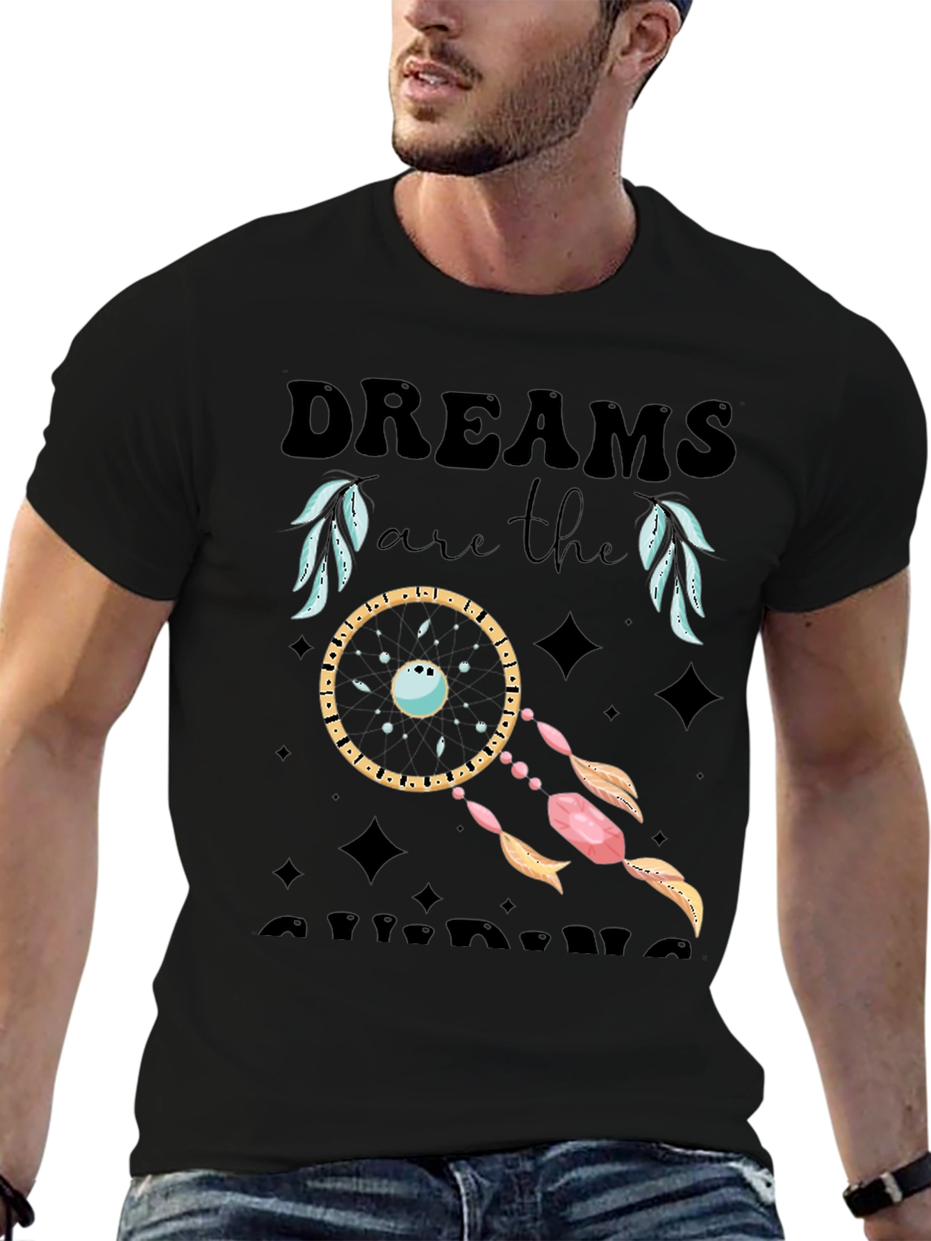 Embrace your dreams with this unique black t-shirt. Featuring a captivating design with a dreamcatcher motif, adorned with beads, feathers and botanical accents. The shirt showcases the phrase "Dreams are the Answer", which is set in a stylish font. Made from a soft and breathable fabric, this tee is perfect for everyday wear or as a statement piece for those who are inspired by native american art. Comfortable and eye-catching, it's ideal for casual outings, relaxing at home, or expressing your individuality. A great gift idea!