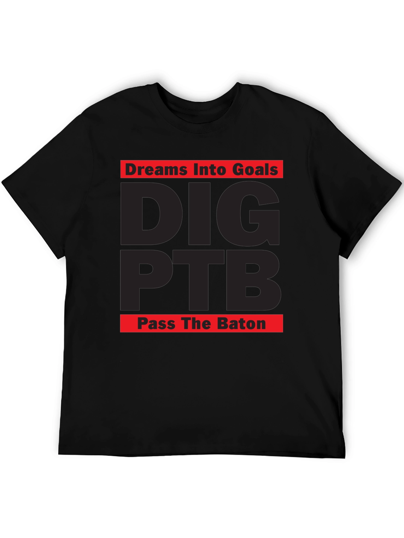 Show your ambition with this bold graphic tee. Featuring motivational phrases "Dreams Into Goals" and "Pass The Baton" emblazoned above and below the abbreviation "DIG PTB", this shirt is designed to inspire. The design has red highlights along the top and bottom, while the rest of the text is dark gray. Crafted from a comfortable material, this tee is perfect for casual wear, workouts, or making a statement. The classic crew neck and short sleeves ensure a timeless fit. Wear your goals with pride and let this tee be a reminder to chase your dreams.