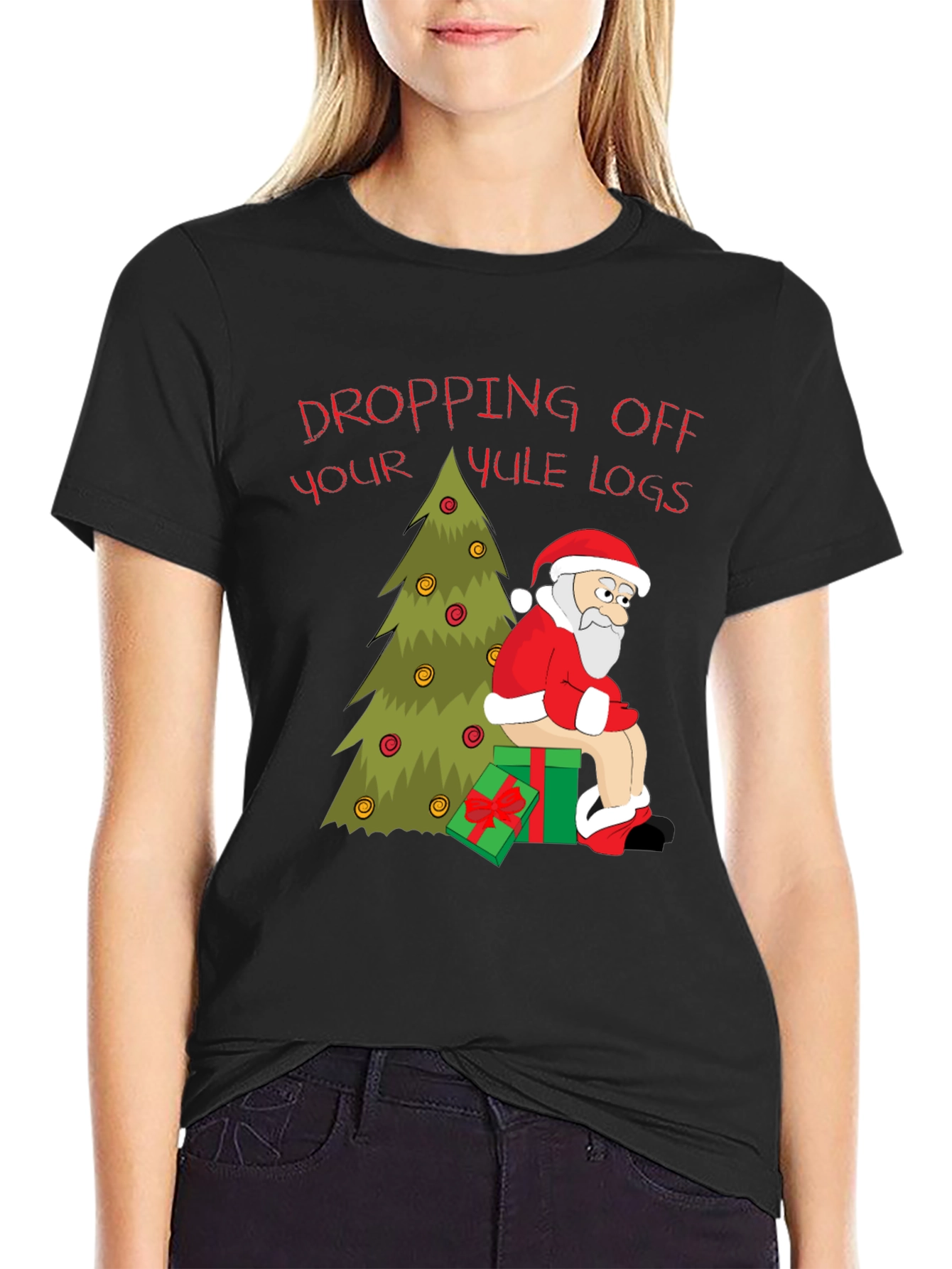 Spread some holiday cheer with this unique graphic tee. The black shirt features a cartoon-style design of Santa Claus taking a break on top of Christmas present next to a christmas tree. The amusing design is complemented by the festive text "Dropping Off Your Yule Logs", making it a great conversation starter at holiday parties. Made from a soft, comfortable fabric, this tee is perfect for casual wear during the Christmas season. Show off your sense of humor with this light-hearted, festive shirt.