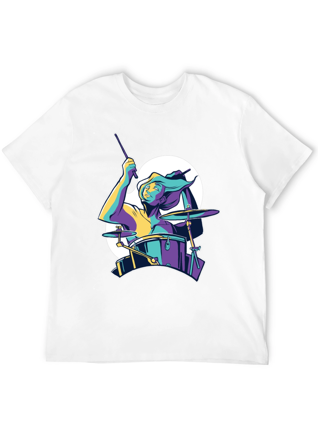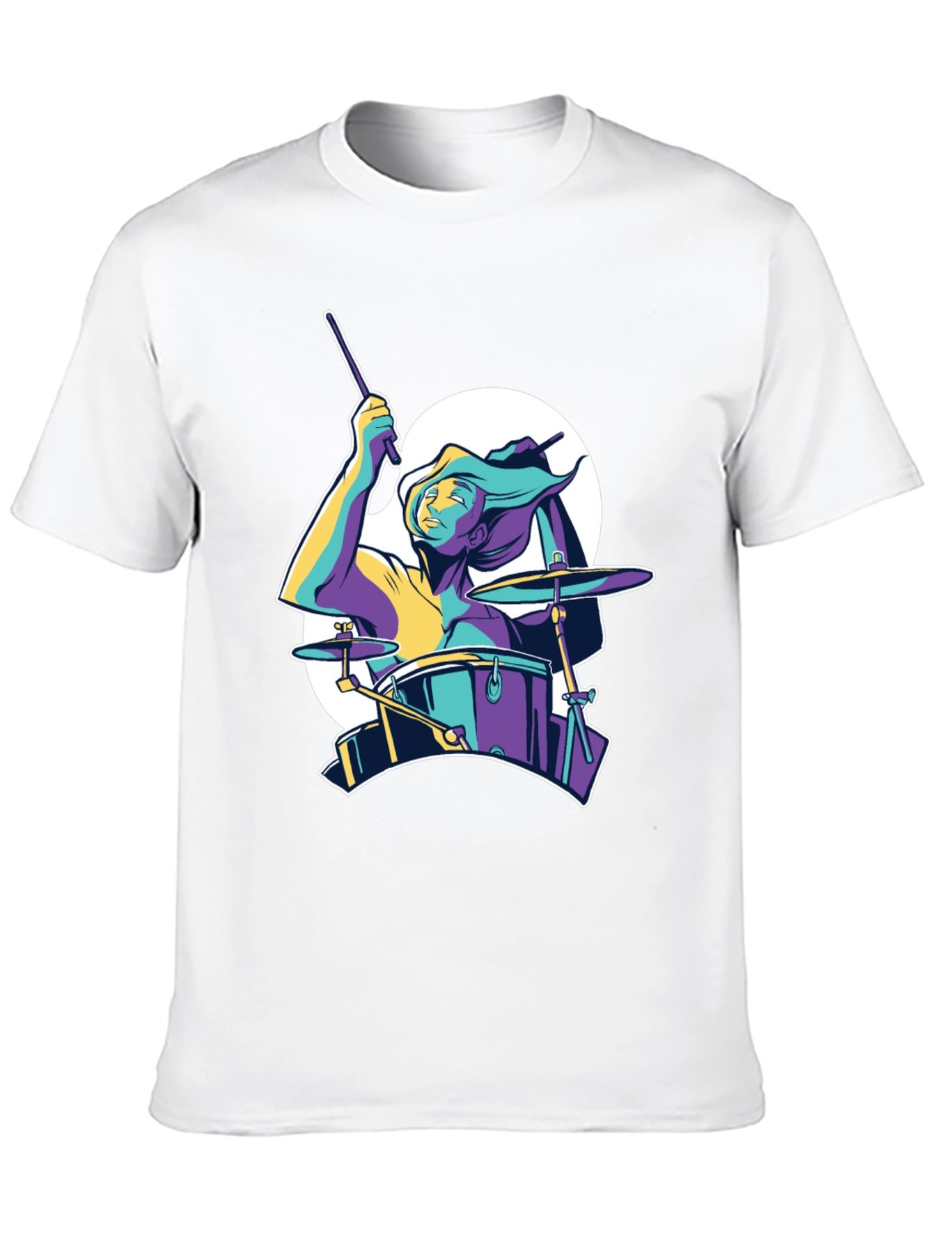Showcase your love for music with this eye-catching black T-shirt! The shirt features a vibrant, cartoon-style graphic of a drummer in action. The design utilizes bold colors and a dynamic pose, set against a clean white backdrop. Perfect for casual wear, concerts, or band practice. Made from a comfortable fabric, this tee is sure to become a favorite in your wardrobe. It's a great way to express your passion for music and stand out in style! Get yours now and make a statement!