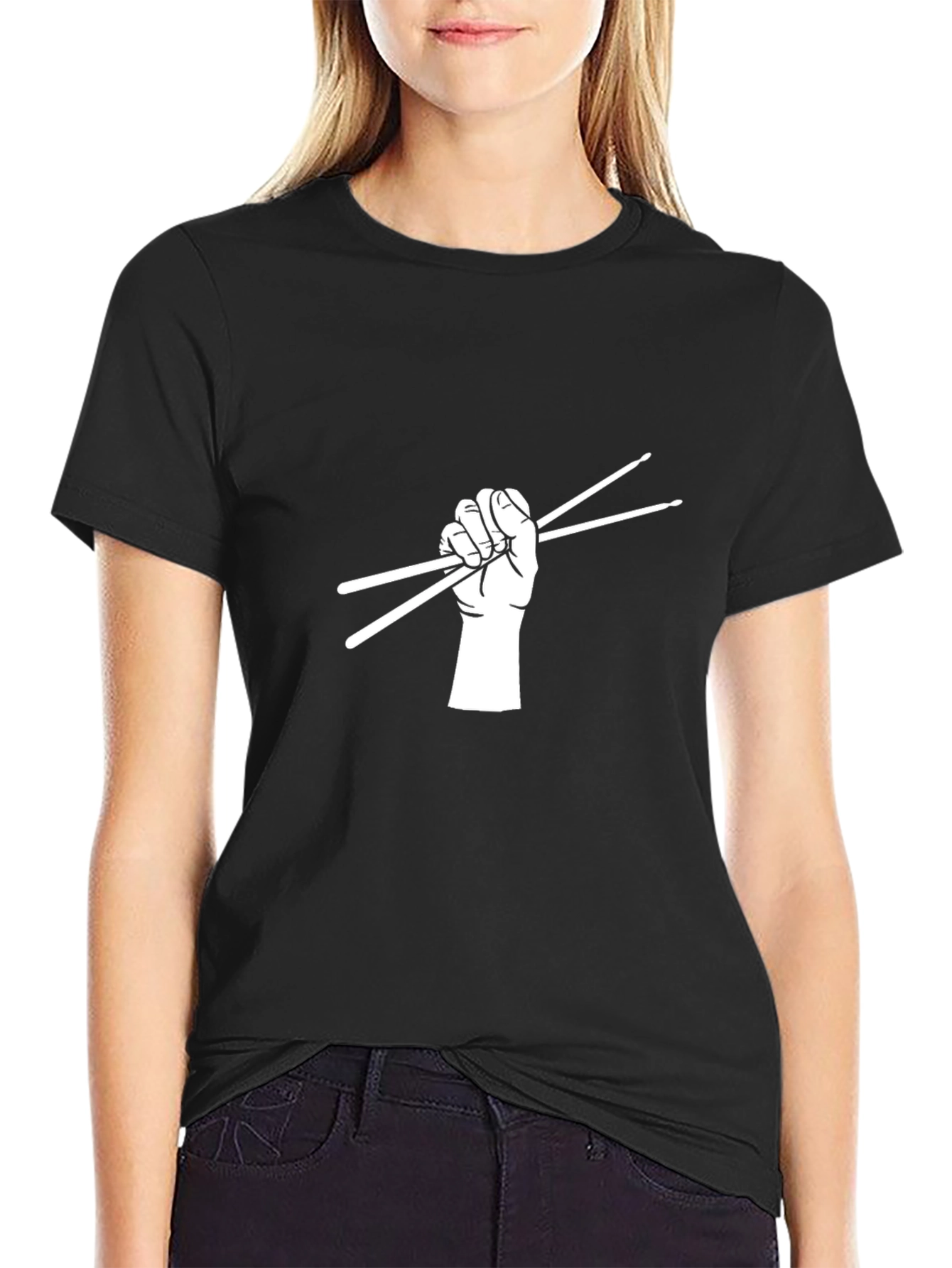 Showcase your love for drumming with this eye-catching black t-shirt. The shirt features a bold, white graphic of a hand gripping a pair of drumsticks. Made from a soft, comfortable fabric, this tee is perfect for casual wear, band practice, or concerts. The striking design makes it a great conversation starter for any drummer or music enthusiast. Wear it with pride and let the world know about your passion for rhythm and beats. Express your musical side with this unique and stylish drummer t-shirt.