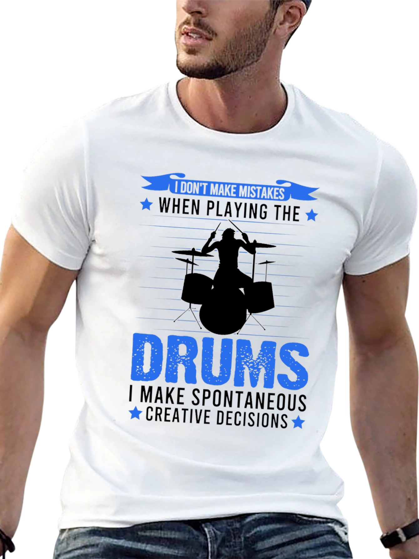 This black t-shirt features a humorous slogan for drummers. The design includes the text, "I DON'T MAKE MISTAKES WHEN PLAYING THE DRUMS, I MAKE SPONTANEOUS CREATIVE DECISIONS," alongside a silhouette graphic of a drummer playing a drum set. The playful message and musical theme make this shirt a great choice for drummers and music enthusiasts alike. Made from comfortable fabric, it's perfect for casual wear, band practice, gigs, or as a fun gift for the drummer in your life. Show off your musical passion with this unique and stylish tee!