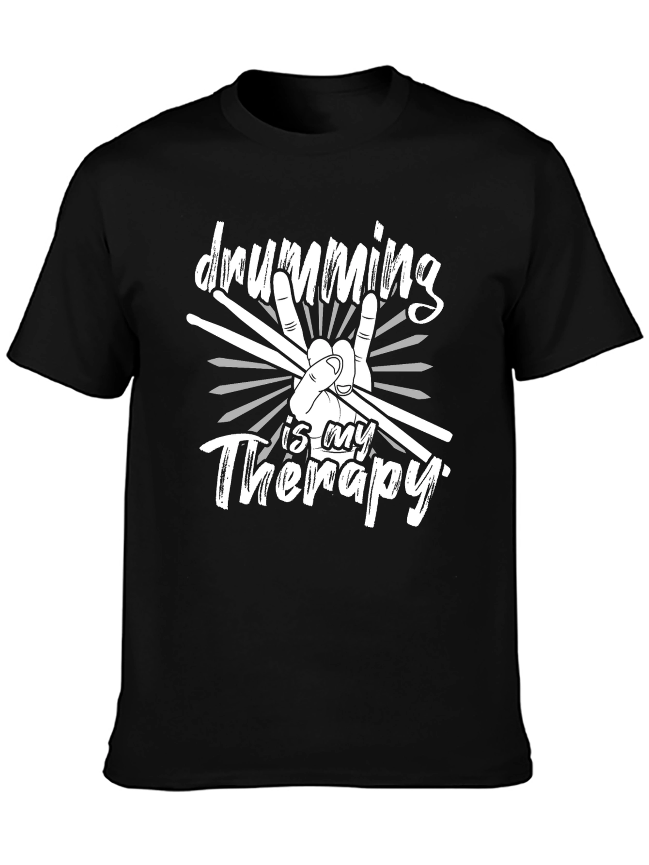 Show off your love for drumming with this stylish black t-shirt. Featuring a bold graphic design that reads "Drumming is my Therapy," complete with drumsticks and a hand making the "rock on" sign, this shirt is perfect for any drummer or music enthusiast. The design is printed in white, making it pop against the black background. Made from what appears to be a soft, comfortable material, it's ideal for everyday wear, band practice, or concerts. A great gift for the drummer in your life, or as a treat for yourself! Express your passion and make a statement with this unique and eye-catching tee.