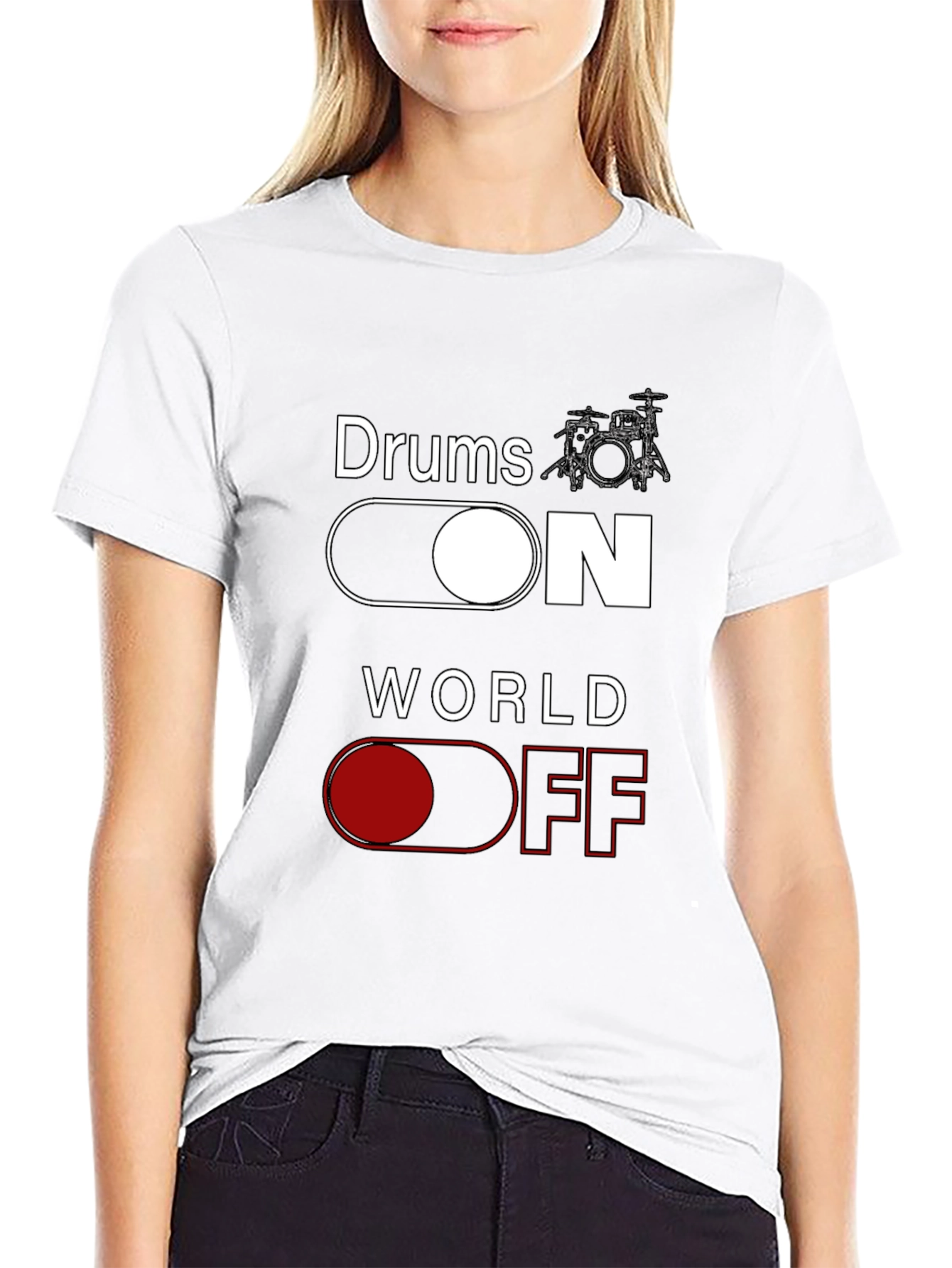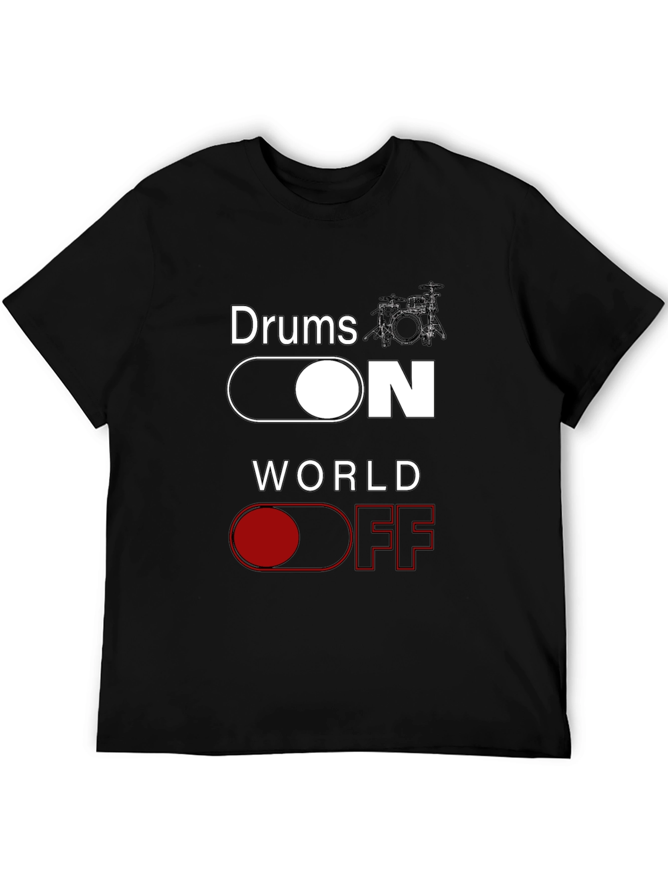 Show your passion for drumming with this stylish black T-shirt! This unique tee features a creative "Drums ON, World OFF" design with a toggle switch graphic in white and red. A subtle drum set illustration adds a nice touch. Made from comfortable materials, this shirt is perfect for musicians, drum enthusiasts, or anyone who wants to express their love for music. Wear it to band practice, concerts, casual outings, or simply when you want to rock your own beat. Grab yours and let the world know where your focus lies!