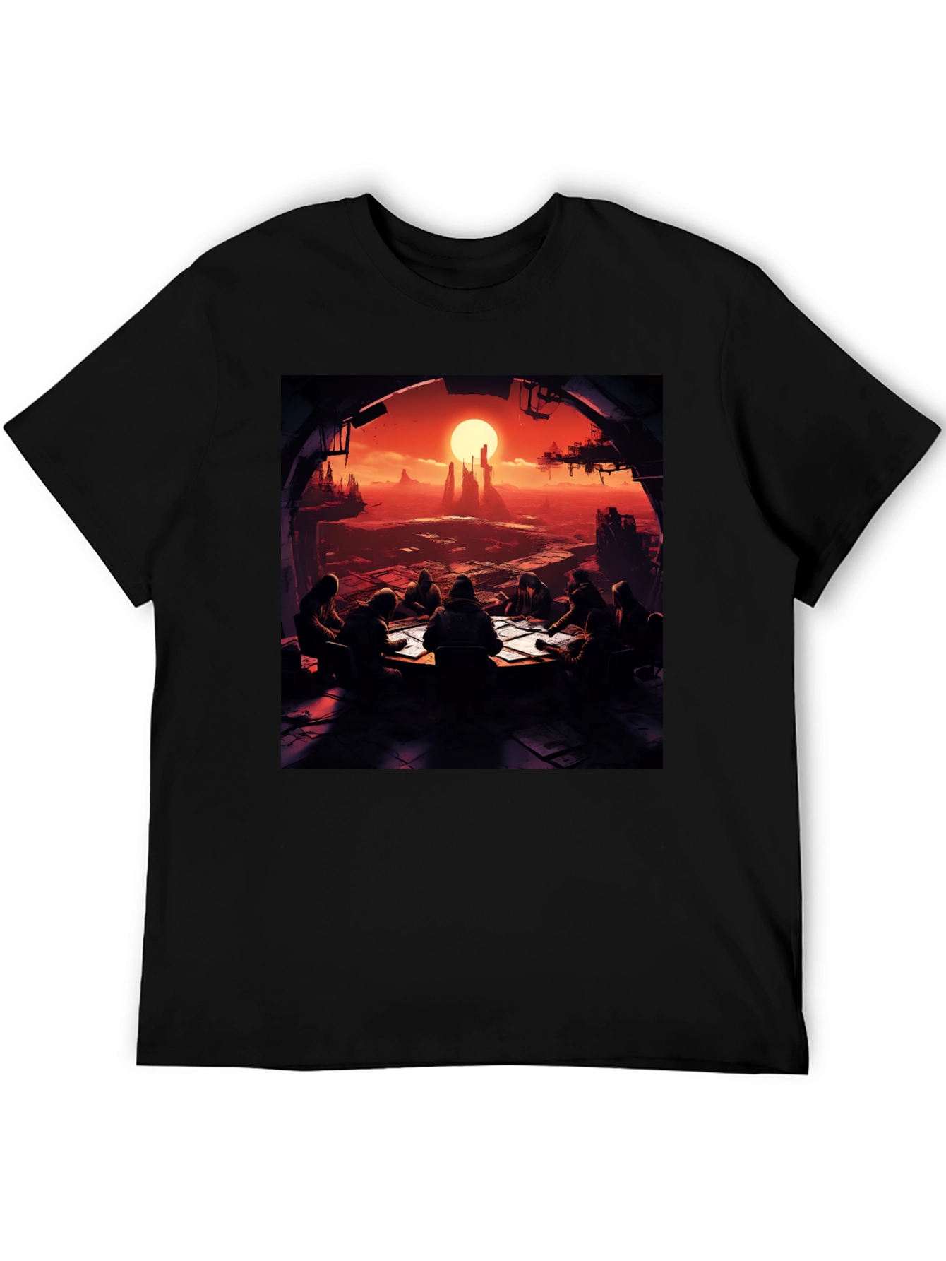 This striking black t-shirt features a vivid graphic print of a dystopian landscape. The design showcases a group gathered around a table, strategizing against a fiery sunset backdrop. The image suggests a scene of resilience and collaboration in a harsh, otherworldly environment. The tee is made of what appears to be a soft, comfortable material, ideal for everyday wear. Perfect for fans of sci-fi, gaming, or anyone who appreciates unique, eye-catching apparel. Wear this tee to express your individuality and spark conversation wherever you go. Ideal for casual outings, gaming conventions, or simply lounging at home.