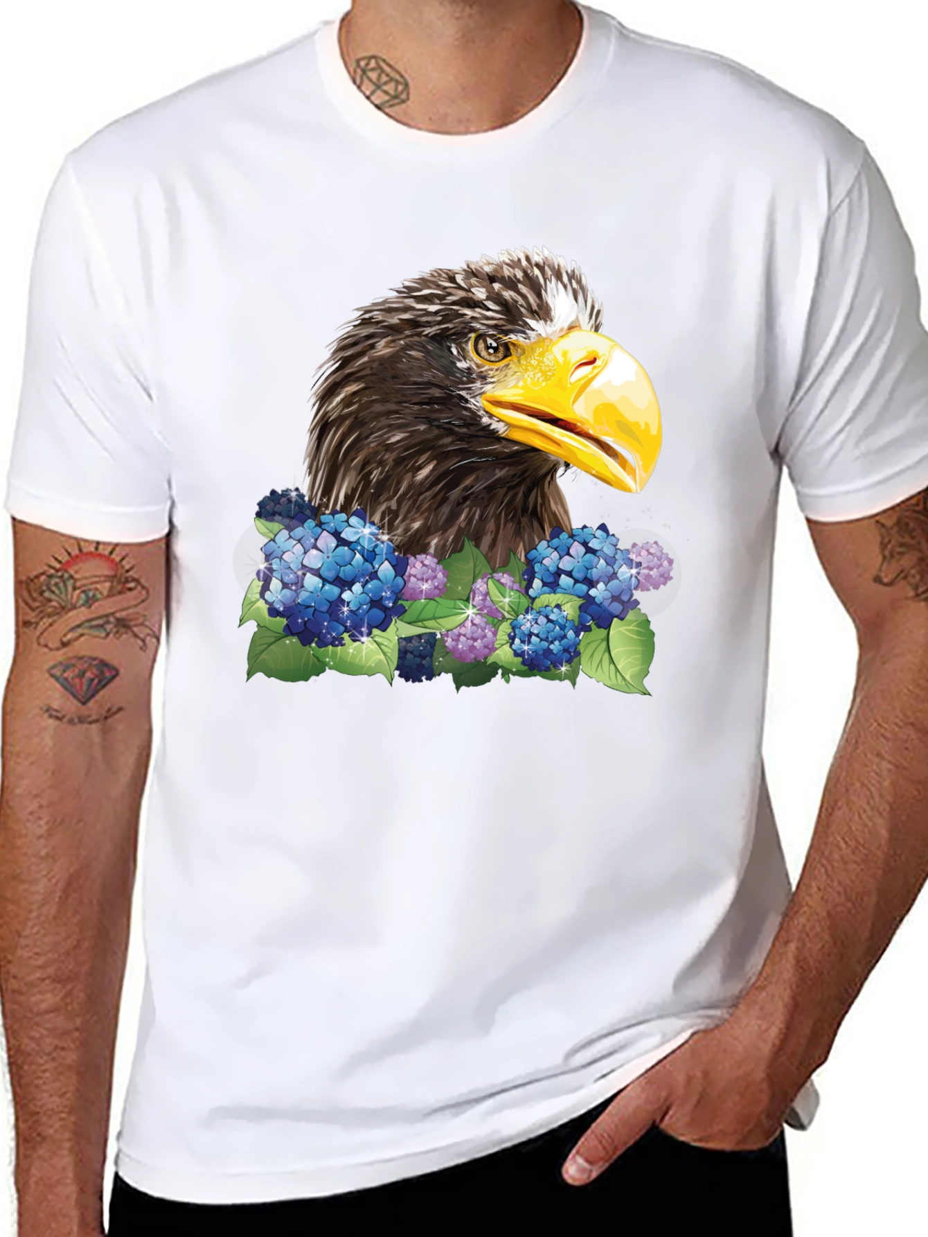 Showcase your wild side with this bold black t-shirt. The eye-catching design features a detailed graphic of an eagle's head nestled amongst vibrant blue and purple flowers with green leaves. The high-quality print ensures lasting color and sharpness. Made from soft and breathable fabric, this t-shirt offers both comfort and style. Perfect for casual wear, concerts, or expressing your unique personality. Pair with jeans or shorts for a relaxed, trendy look. Upgrade your wardrobe today with this distinctive eagle tee!