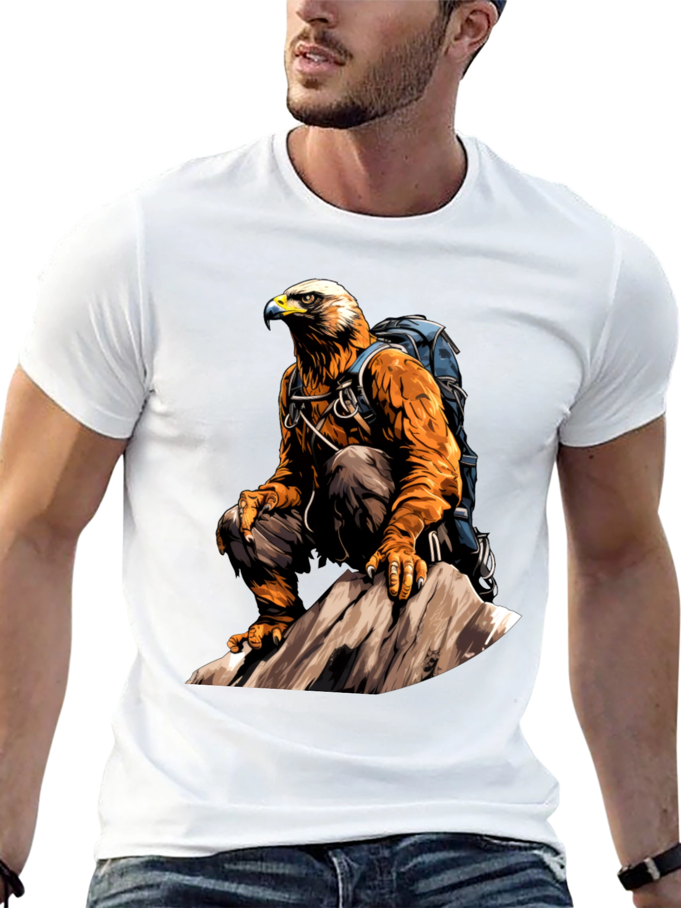 Show your love for the outdoors with this unique graphic tee. Featuring an eagle with a backpack perched on a mountain, this eye-catching design is perfect for nature lovers. The t-shirt is made from a soft, comfortable fabric, ideal for everyday wear or outdoor adventures. Its classic black color ensures it pairs well with any outfit. Stand out from the crowd and express your adventurous spirit with this one-of-a-kind eagle hiker t-shirt.
