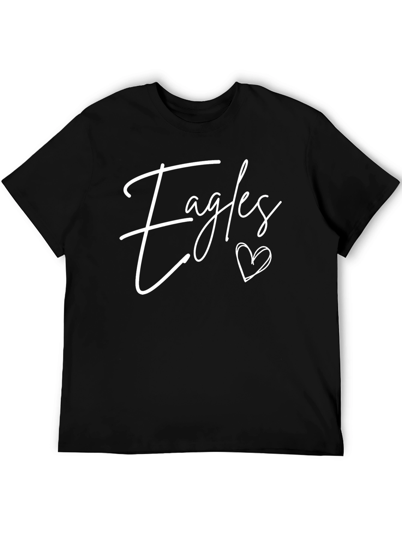 Show your love for the Eagles with this stylish black graphic tee. Made from comfortable cotton, this t-shirt features a unique 'Eagles' design in a flowing script font, complemented by a cute heart graphic. The simple yet eye-catching design makes it perfect for casual wear, game day, or showing your team spirit. The classic black color ensures versatility, pairing easily with jeans, shorts, or leggings. A must-have for any true Eagles fan looking for a fashionable way to represent their favorite team!