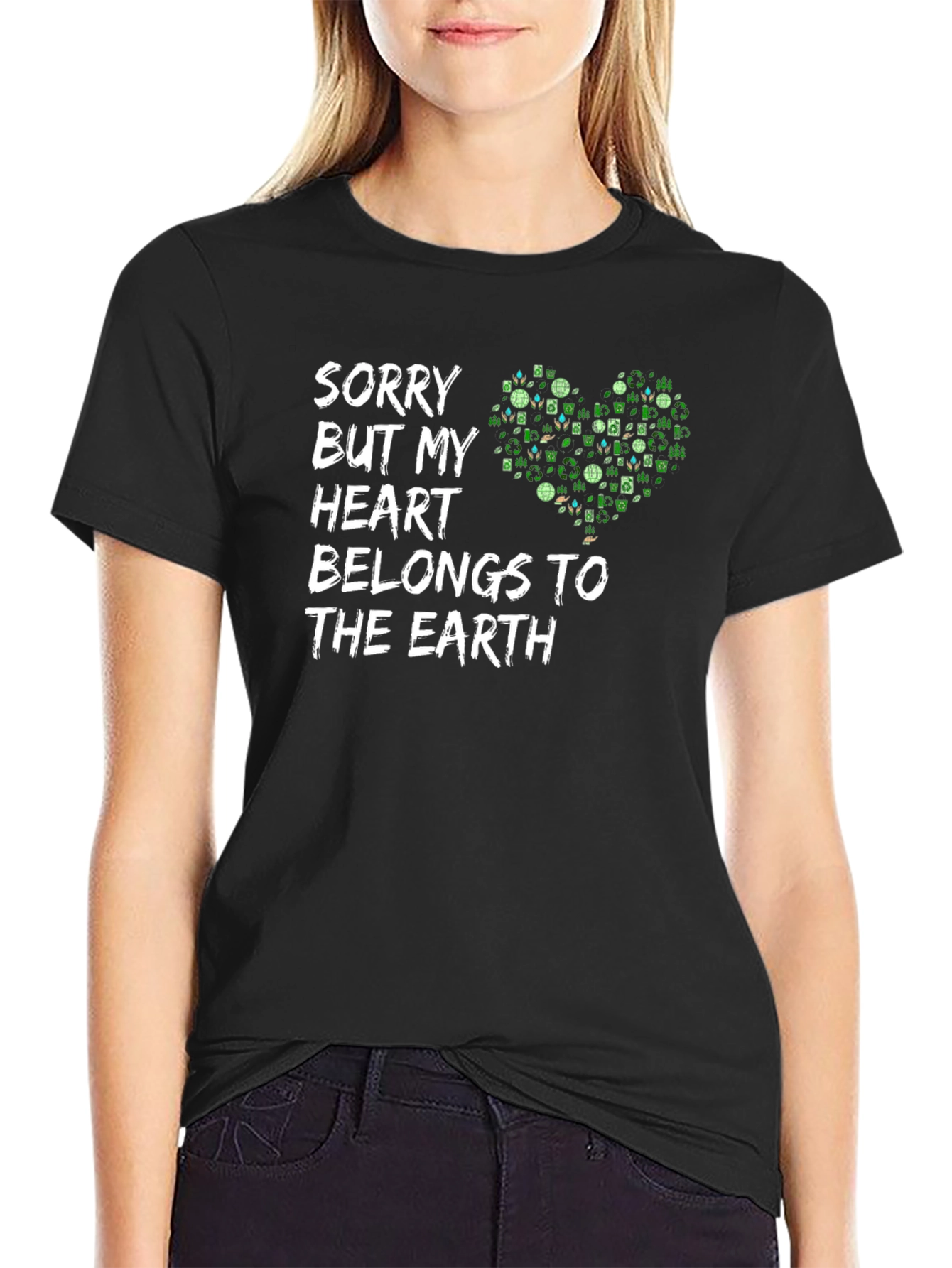Show your love for the planet with this unique graphic t-shirt! This black tee features a striking white text design that reads "Sorry but my heart belongs to the earth." The design is complemented by a heart symbol filled with nature-themed icons, representing various aspects of our beautiful planet. Made from a comfortable and durable fabric, this t-shirt is perfect for everyday wear. Whether you're hiking in the mountains, attending an environmental event, or simply relaxing at home, this shirt is a great way to express your passion for protecting the environment. It's also a thoughtful gift for the eco-conscious individuals in your life.