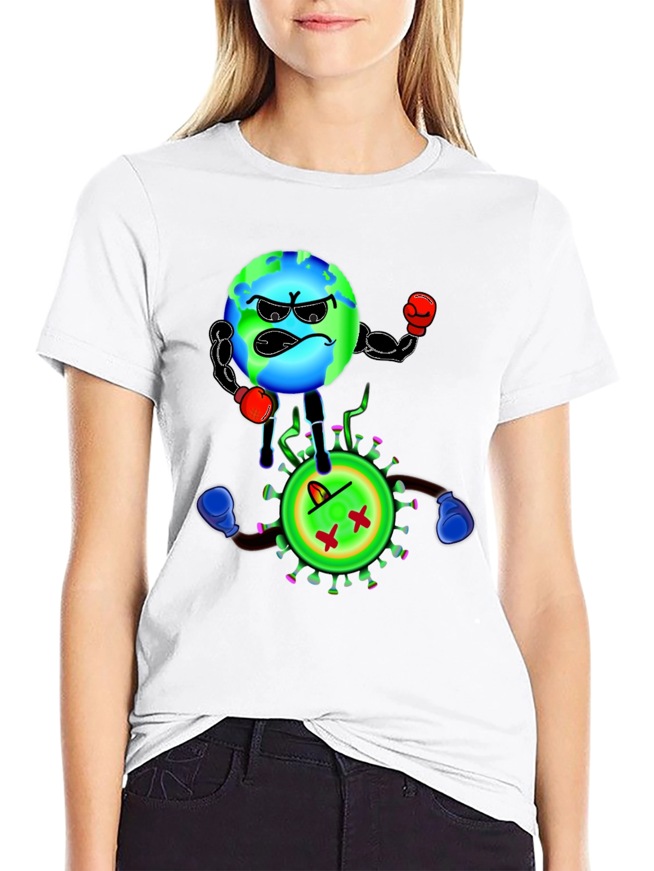 Show your support for the Earth with this unique black t-shirt. Featuring a bold graphic design, it depicts the Earth as a strong boxer defeating a virus. The tee is made from a comfortable material, ensuring a great fit and feel. This shirt is perfect for casual wear, making a statement, or sparking conversations about global health. Wear it to the gym, out with friends, or just relaxing at home. Get yours today and join the fight for a healthier planet!