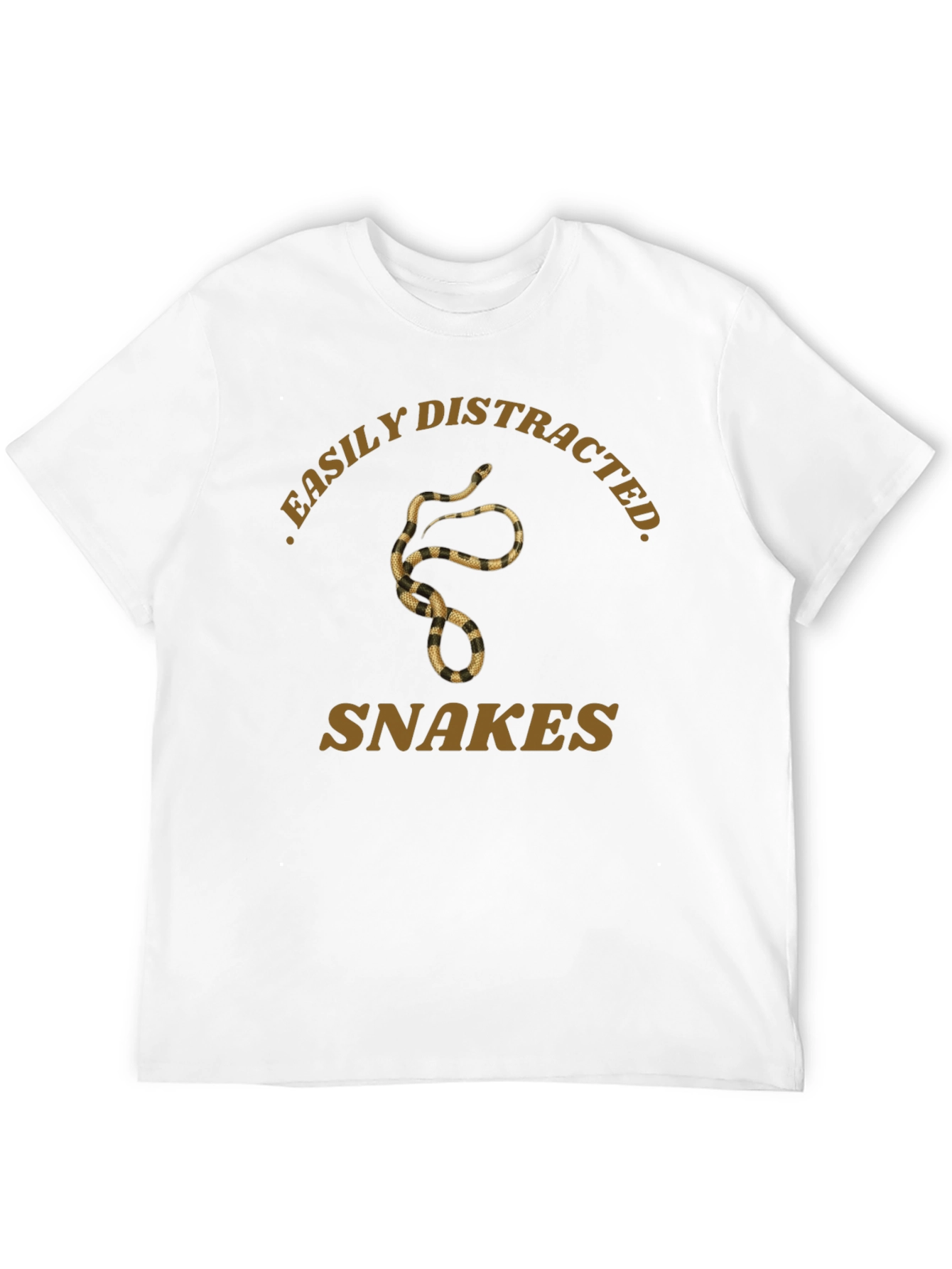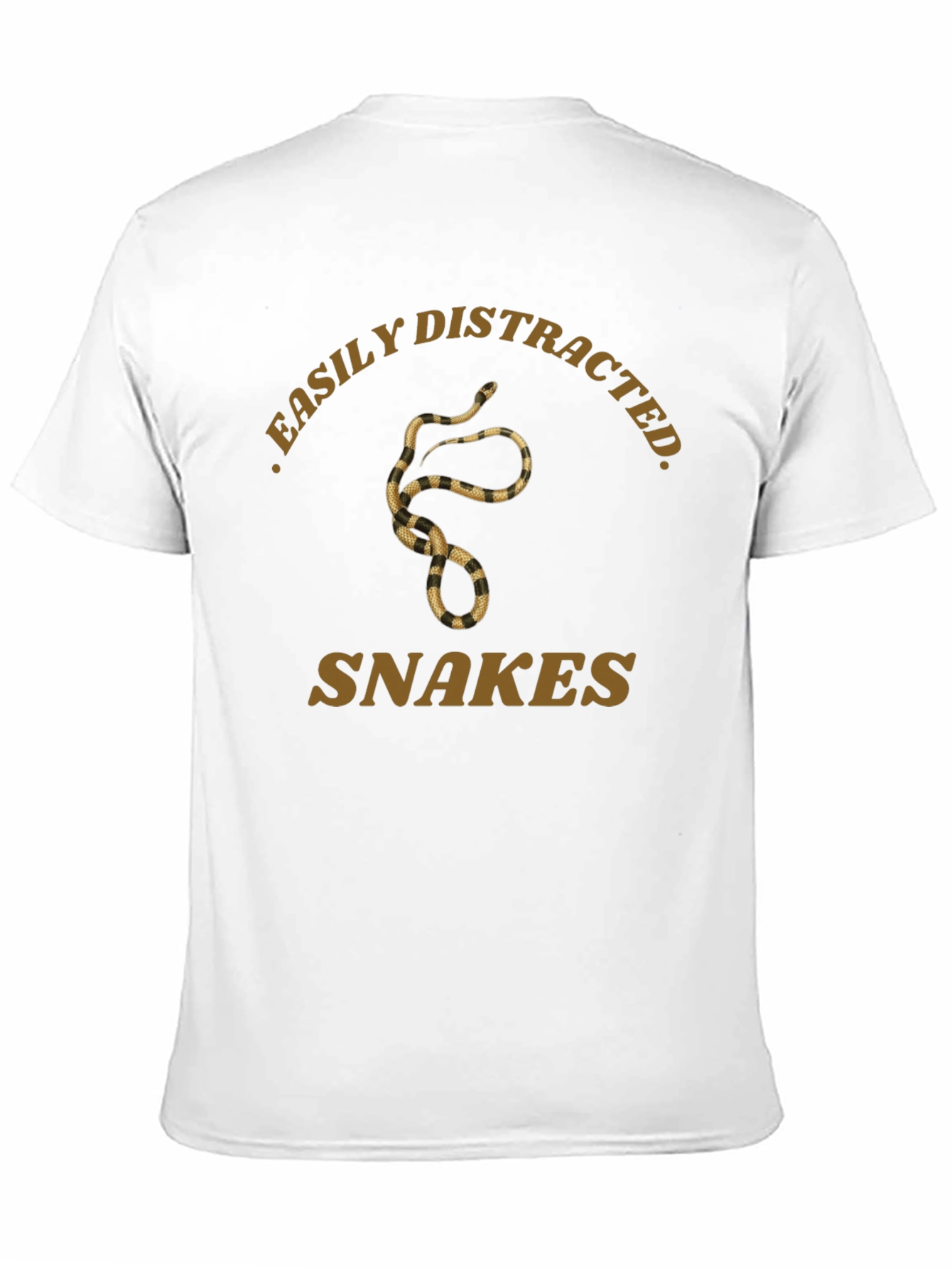 This classic fit black t-shirt features a humorous graphic design that's sure to turn heads. The phrase "Easily Distracted. Snakes" is printed in a vintage gold color, encircling a detailed illustration of a striped snake. Made from a comfortable, breathable fabric, this tee is perfect for everyday wear. Show off your love for reptiles and your quirky sense of humor with this unique shirt. Ideal for casual outings, weekend adventures, or simply lounging at home. A must-have for any snake enthusiast!
