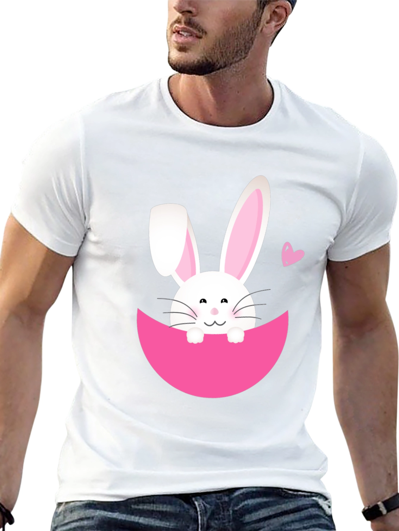 Hop into spring with this adorable black t-shirt featuring a cheerful Easter bunny graphic! The design showcases a white bunny peeking out from a pink, egg-shaped patch. A small pink heart adds a touch of whimsy to the look. Crafted from comfortable material, this tee is perfect for Easter celebrations, casual outings, or simply expressing your love for cute animals. Wear it to an Easter egg hunt, a family gathering, or while relaxing at home. This unique and playful t-shirt is sure to bring smiles wherever you go!