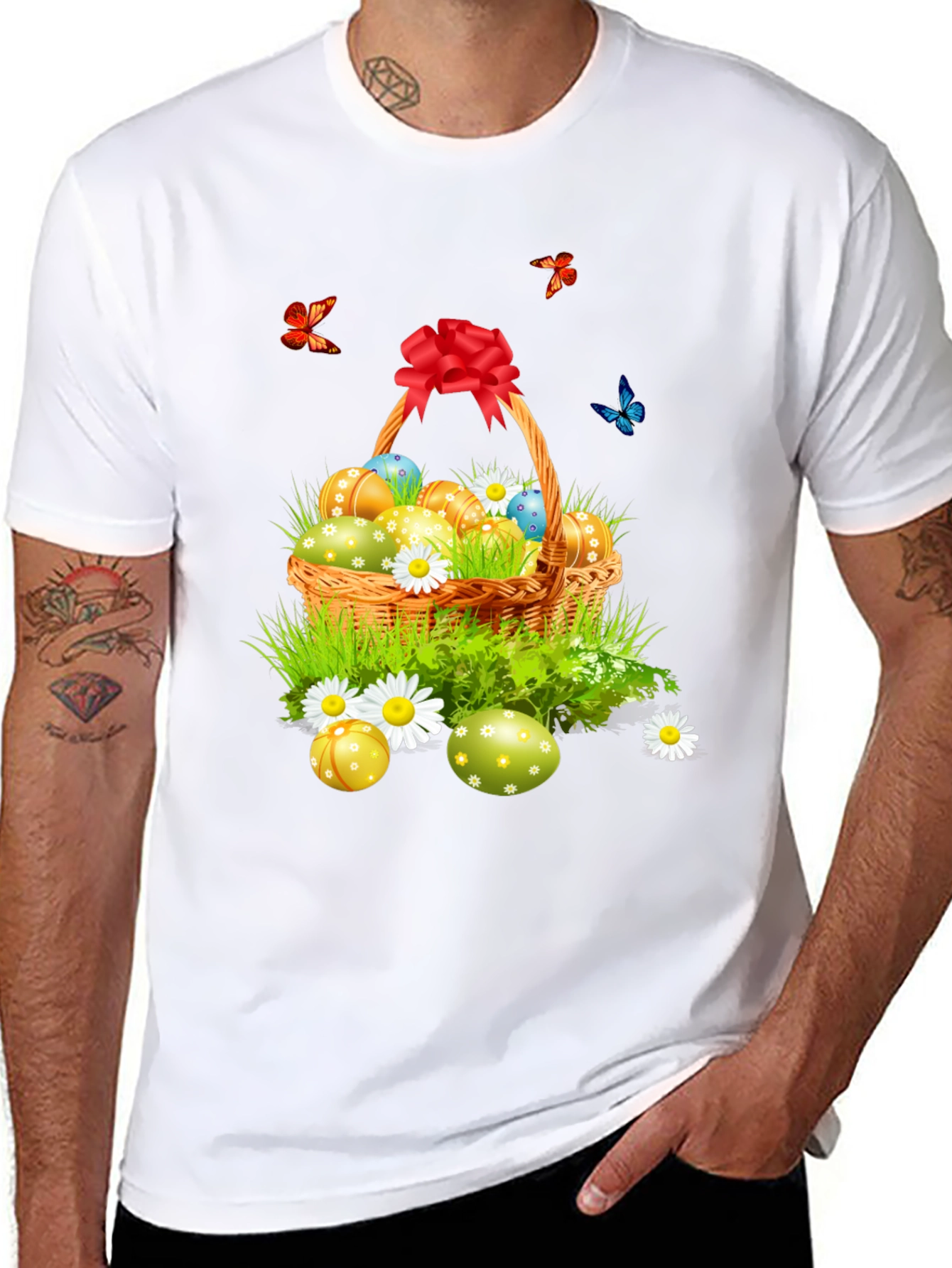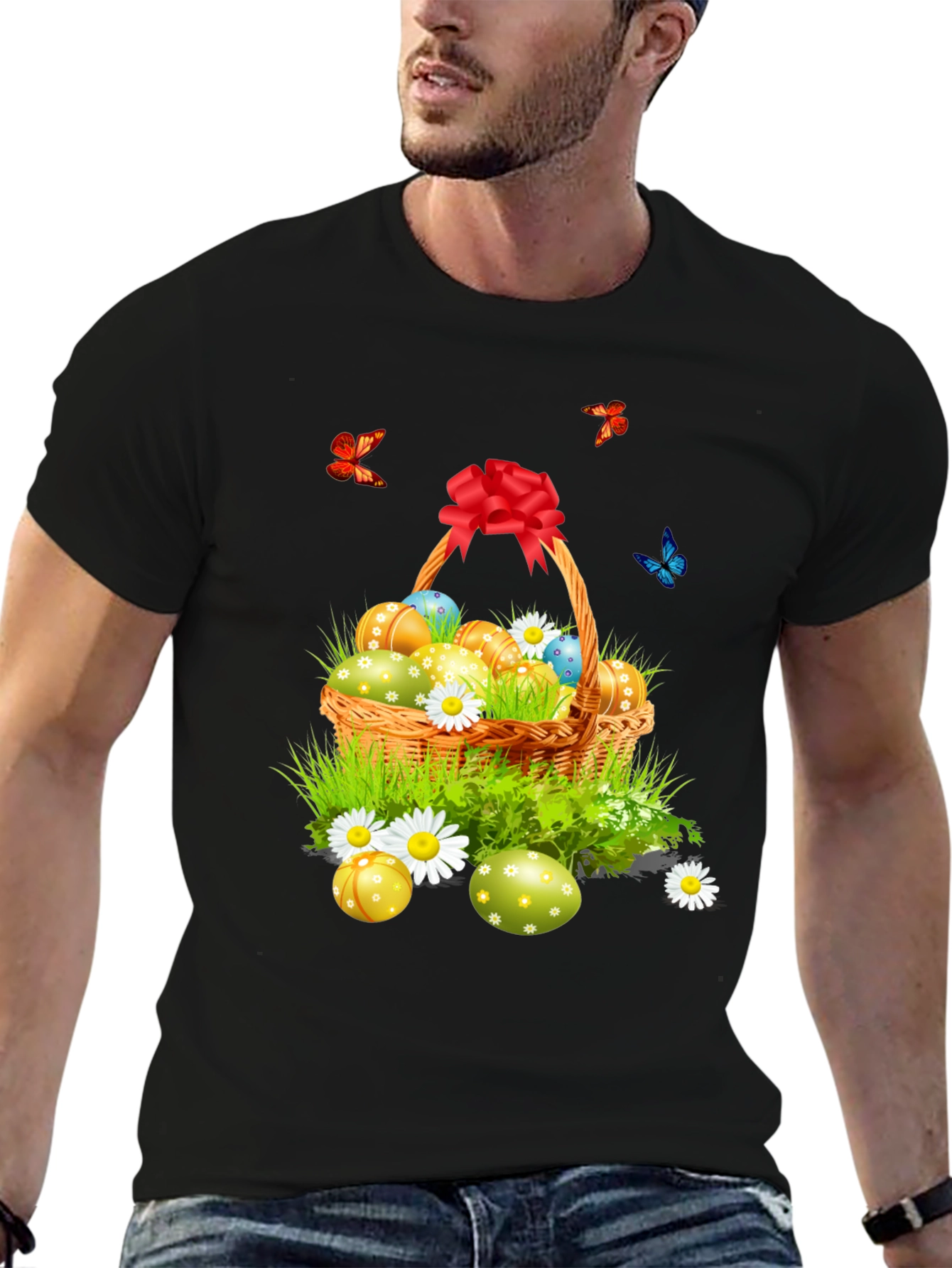 Celebrate Easter with this festive t-shirt! This black tee features a charming graphic of an Easter basket filled with colorful eggs, adorned with daisies and a bright red bow. Butterflies flutter around the basket, adding a touch of whimsy. The design is perfect for Easter egg hunts, family gatherings, or casual wear during the spring season. Made from soft, breathable fabric, this t-shirt offers both style and comfort. Show off your Easter spirit with this delightful tee!