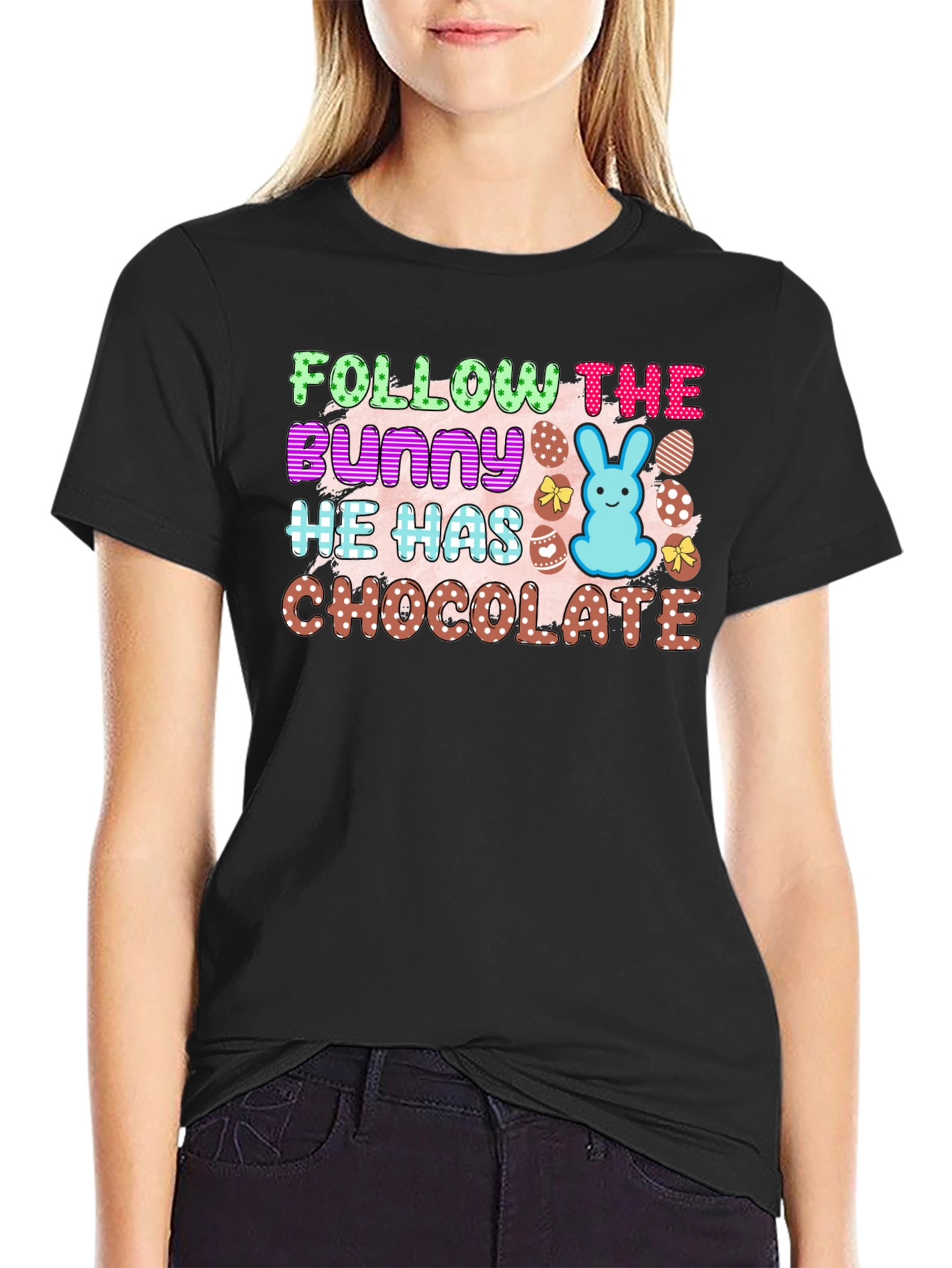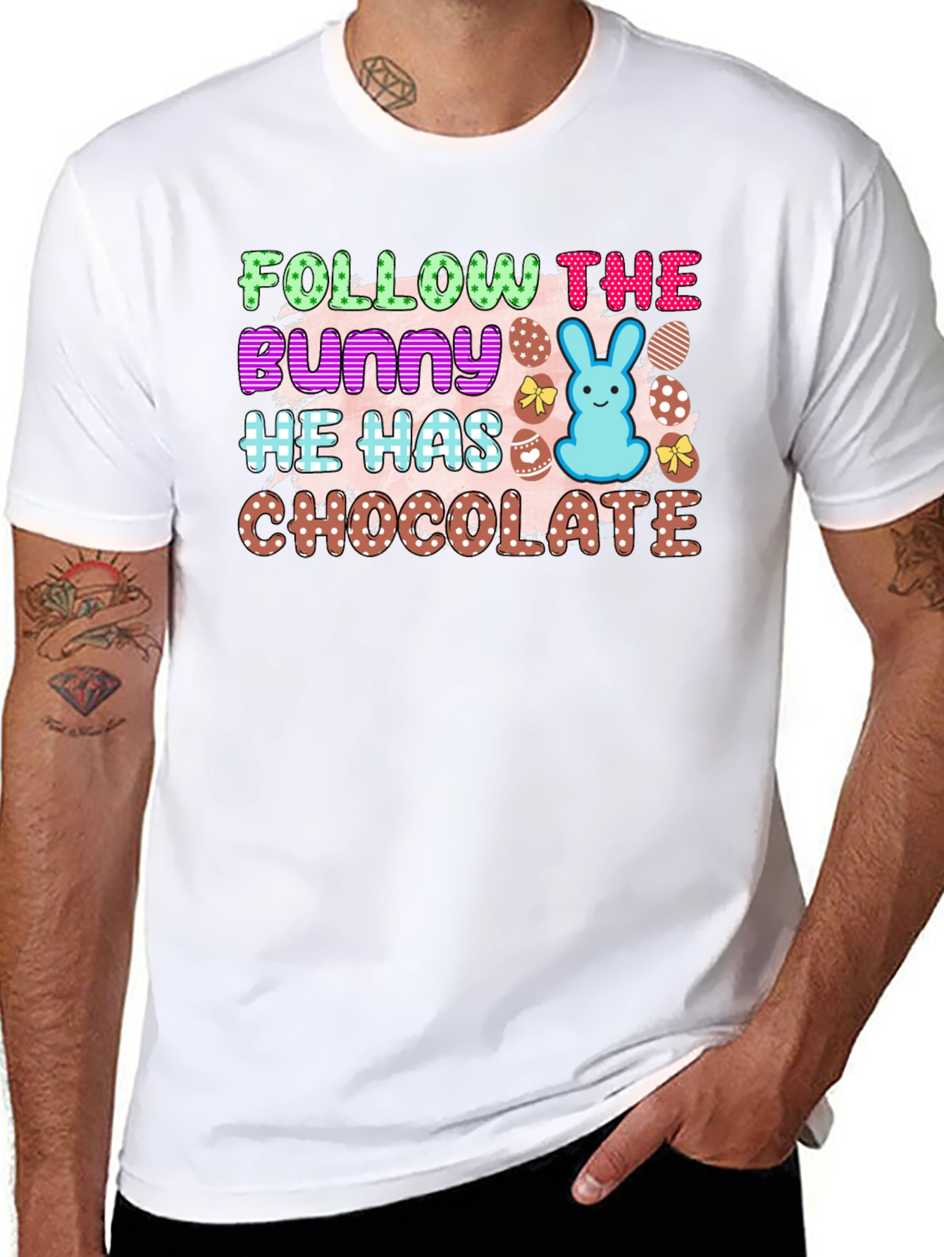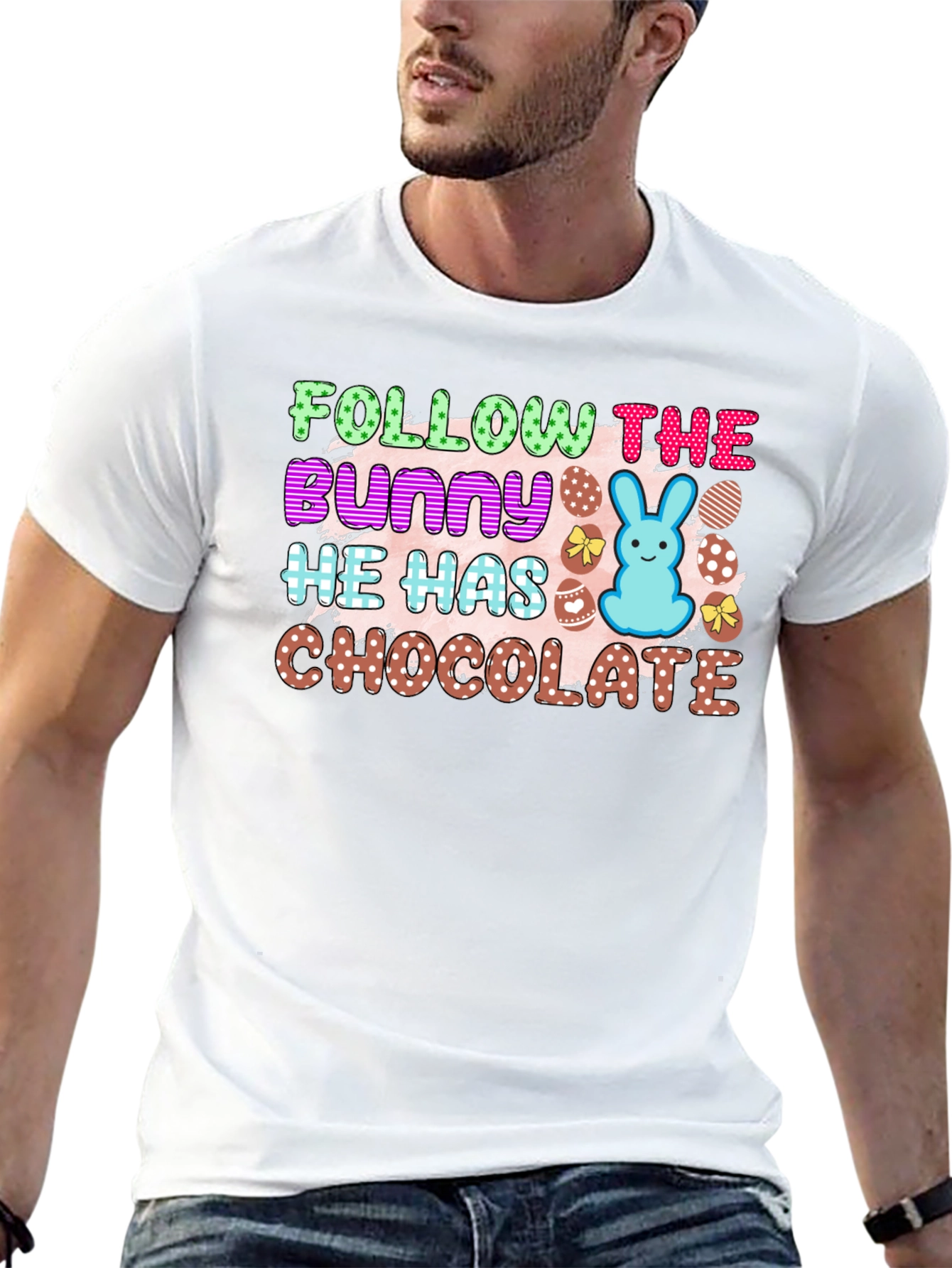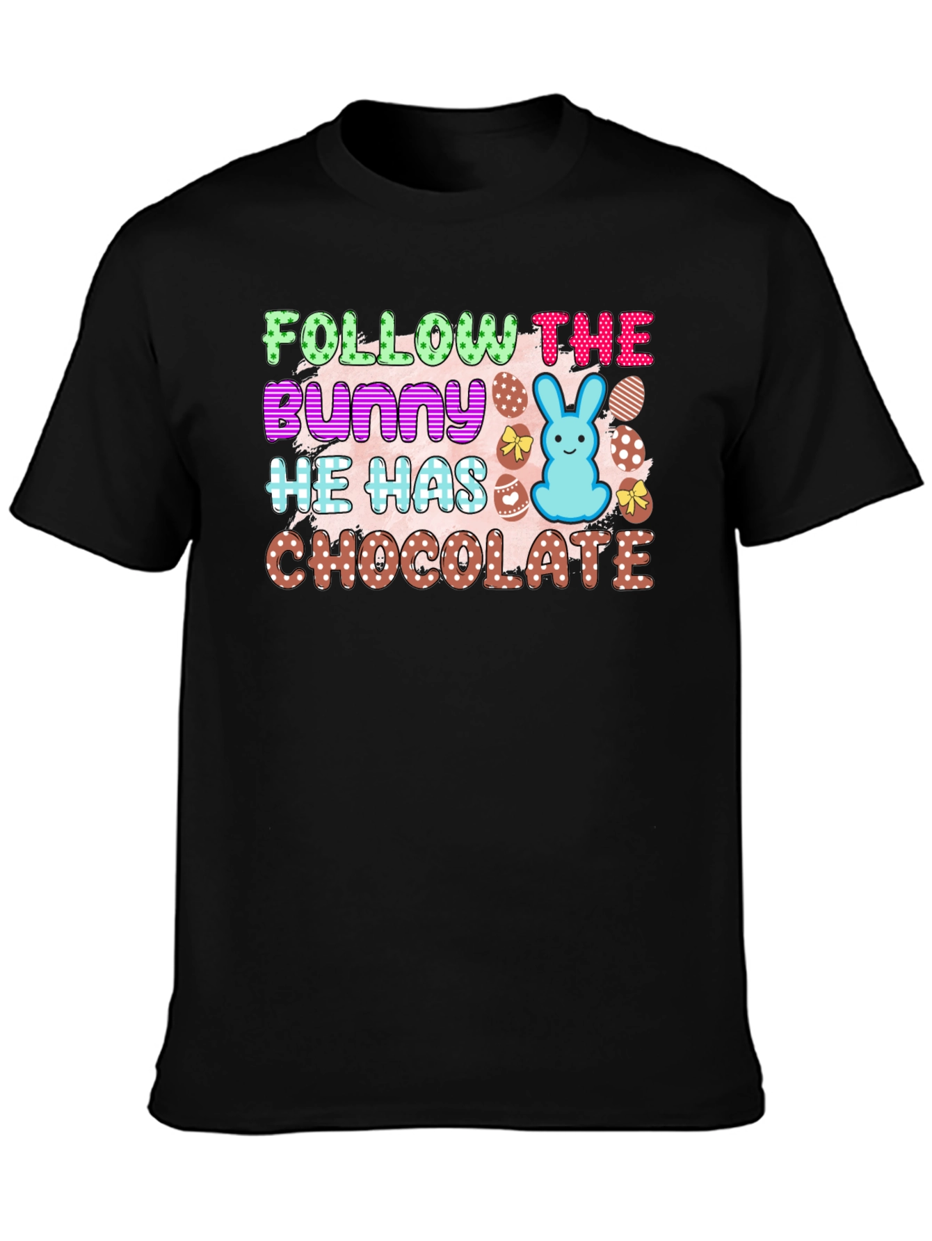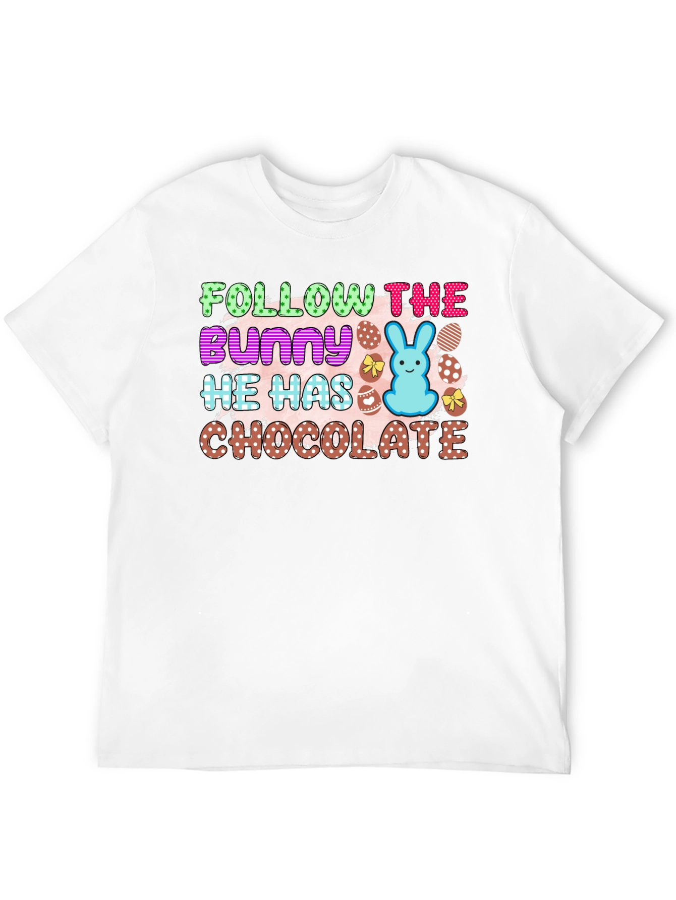 Celebrate Easter in style with this fun and festive t-shirt! Featuring a vibrant design with the playful text "Follow The Bunny He Has Chocolate," this shirt is perfect for Easter egg hunts and springtime gatherings. The design incorporates colorful polka-dotted lettering, a cute blue bunny, and decorated eggs, adding a cheerful touch. Crafted from a comfortable, breathable fabric, this t-shirt ensures all-day comfort. Show off your love for Easter with this unique and eye-catching tee. It’s the perfect attire for celebrating the holiday with family and friends!