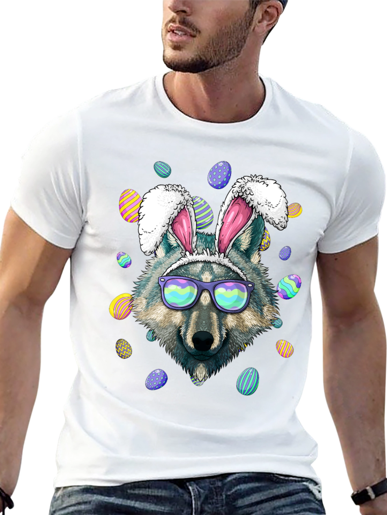 Hop into spring with this unique Easter-themed graphic t-shirt! Featuring a cool wolf wearing fluffy bunny ears and stylish sunglasses, this eye-catching design is surrounded by colorful Easter eggs. The black tee provides a sharp contrast, making the vibrant graphics pop. Perfect for Easter parties, casual outings, or as a fun gift for animal lovers. This comfortable and stylish tee is sure to turn heads and spread Easter cheer wherever you go.