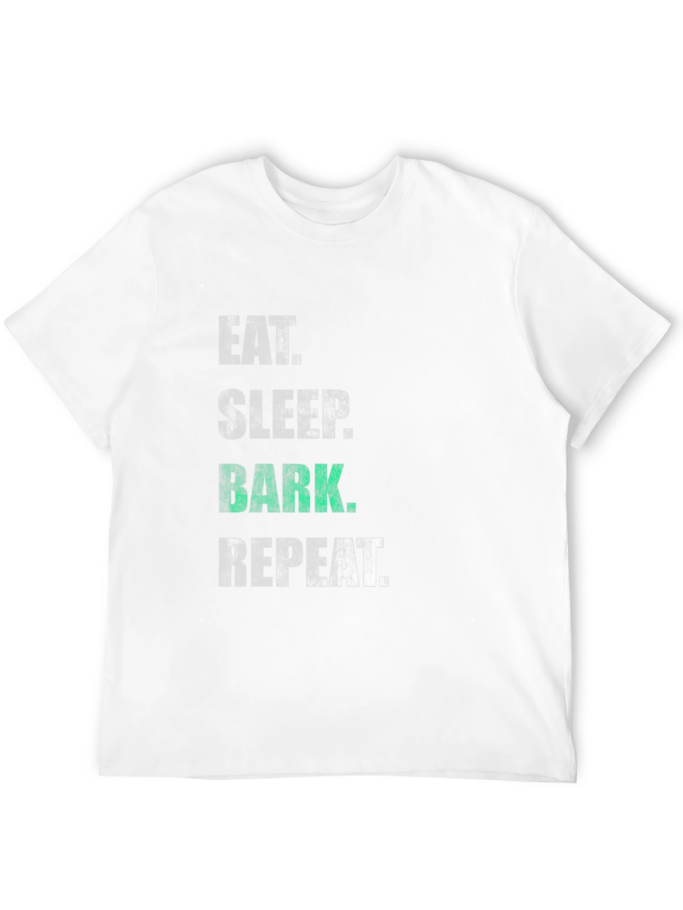 Show off your love for dogs with this funny and stylish black t-shirt. Featuring the phrase "Eat. Sleep. Bark. Repeat." in a distressed, vintage-inspired font, this tee is perfect for any dog lover. The word "BARK" is uniquely highlighted in green, adding a pop of color to the design. Made from soft, breathable fabric, this t-shirt offers a comfortable fit for everyday wear. It's ideal for casual outings, dog park visits, or simply relaxing at home. Get yours today and let everyone know you are a proud dog lover!