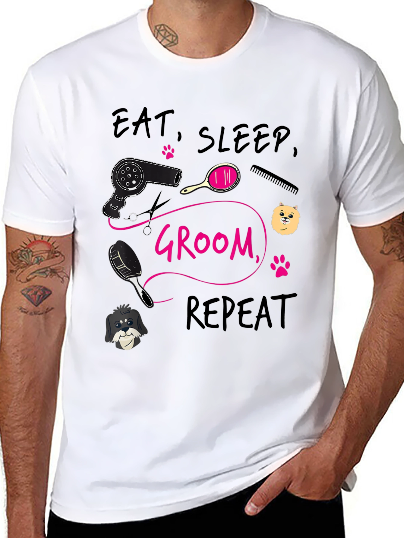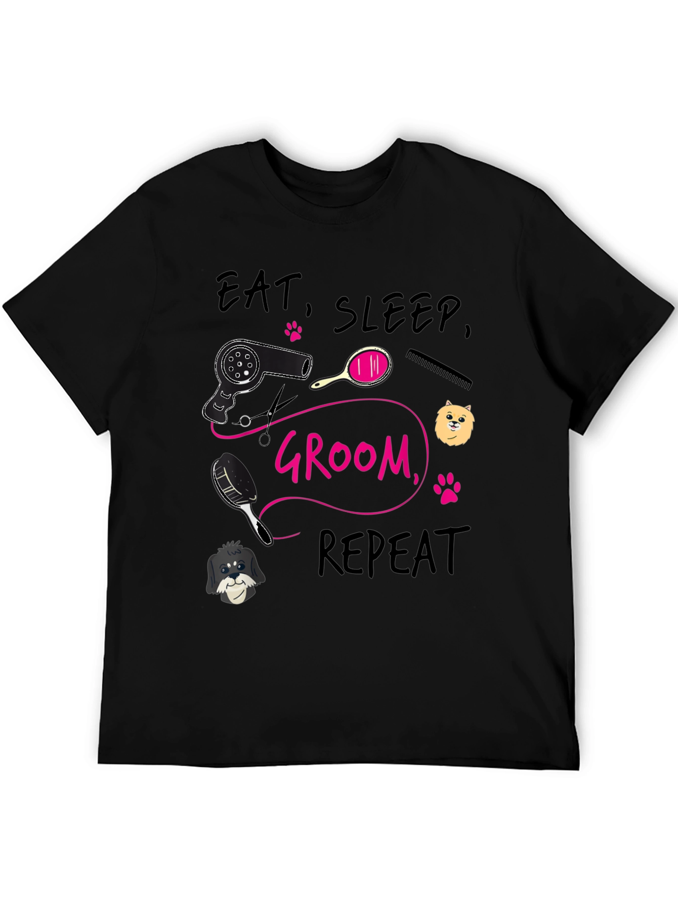 Show off your love for dogs and grooming with this fun and stylish t-shirt! This black tee features a playful graphic design with "Eat, Sleep, Groom, Repeat" text, alongside cute paw prints, dog faces, grooming tools such as a hair dryer, comb, and brushes. Made from comfortable fabric, this shirt is perfect for everyday wear, whether you're a professional groomer, a dog lover, or just want to make a statement. Wear it to the grooming salon, dog park, or casual outings to express your passion for pets and their well-being. A great gift for any dog enthusiast!