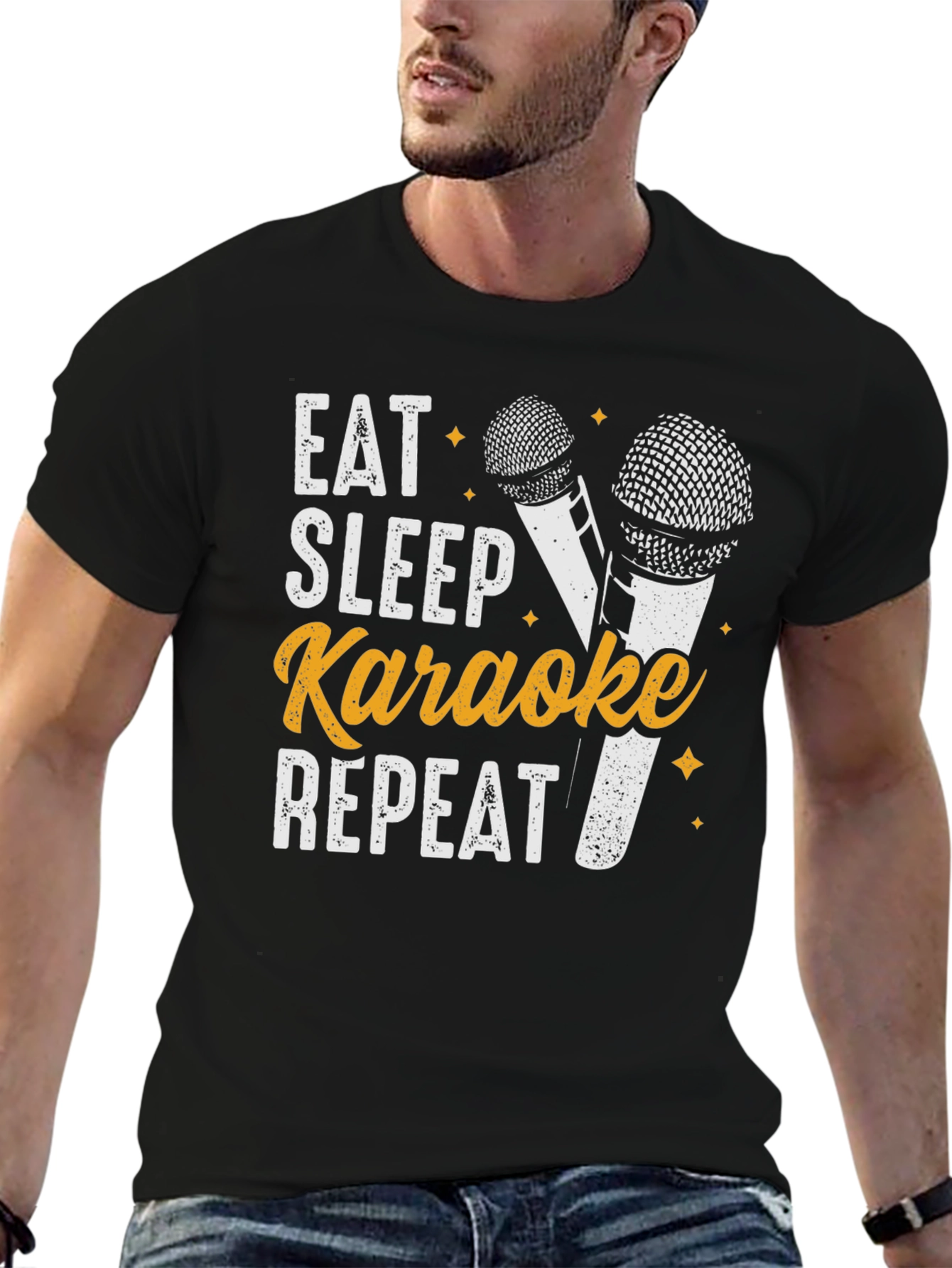 This stylish black t-shirt features a playful graphic design perfect for karaoke enthusiasts. The text "EAT SLEEP Karaoke REPEAT" is printed in a stacked format with "Karaoke" highlighted in a vibrant yellow-orange, creating a visually appealing contrast. Two microphones are illustrated beside the text adding to the karaoke theme. The shirt appears to be made of a comfortable, breathable fabric, suitable for casual wear or a fun night out singing. Show off your love for karaoke with this unique and eye-catching tee!