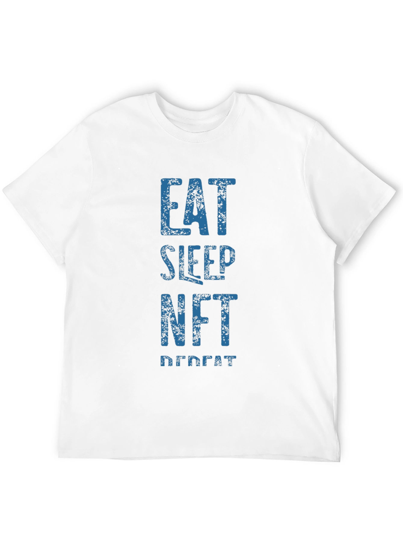 Show off your passion with this bold 'Eat Sleep NFT Repeat' T-shirt. This unique tee is crafted from a soft and comfortable fabric, perfect for everyday wear. The design features a distressed, retro-inspired text print in a striking blue hue against a classic black backdrop. Ideal for NFT enthusiasts and crypto investors, this shirt is a great conversation starter and a stylish way to express your interest in the digital world. Whether you're at a conference, hanging out with friends, or just relaxing at home, this tee is sure to turn heads. Get yours today and let the world know you're all about NFTs!