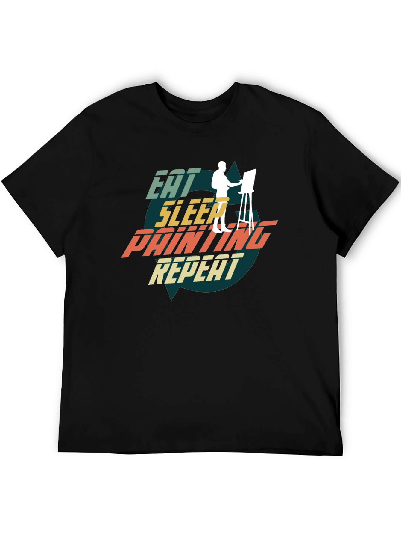 Show off your passion for art with this stylish graphic tee. The black t-shirt features a unique "Eat Sleep Painting Repeat" design in vibrant retro colors, set against a cool teal backdrop with an artist silhouette. Made from comfortable fabric, this t-shirt is perfect for everyday wear, art classes, studio sessions, or casual outings. Express your artistic side while enjoying a comfortable and eye-catching addition to your wardrobe. Grab yours now and let the world know what you love! Makes a great gift for the artists in your life.