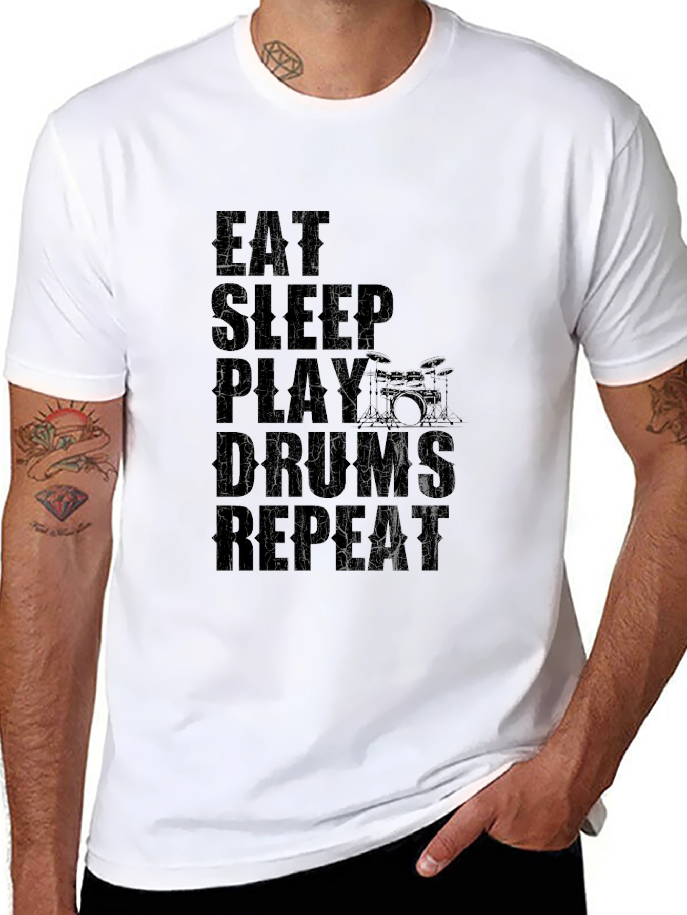 Showcase your passion for drumming with this stylish black graphic tee. The shirt features a distressed "Eat Sleep Play Drums Repeat" design, perfect for drummers and music lovers. Crafted from comfortable materials, this tee offers a relaxed fit for all-day wear. Whether you're jamming with your band, practicing at home, or simply want to express your love for drumming, this t-shirt is a great choice. The bold design makes a statement, while the classic black color ensures versatility with any outfit. Get ready to rock and roll in style with this must-have drumming tee.