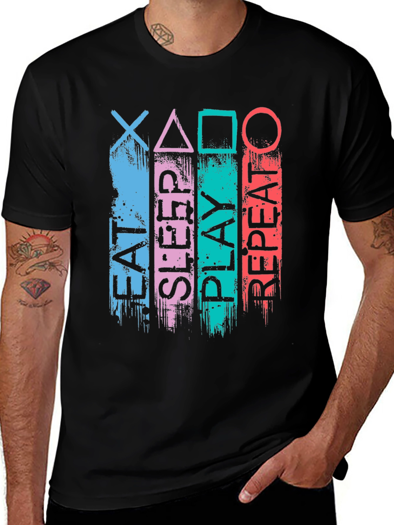 Show your passion for gaming with this stylish black t-shirt. The design features the words "EAT SLEEP PLAY REPEAT" vertically stacked with gaming symbol icons. The graphics have a cool, distressed, vintage aesthetic. Made from what appears to be soft, comfortable cotton, this tee is perfect for casual wear, gaming sessions, or hanging out with friends. A great gift for gamers of all ages!