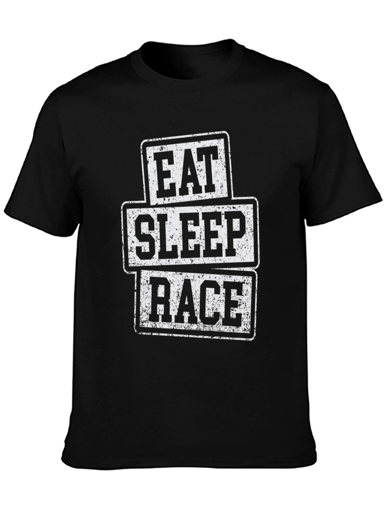 Gear up for your next race day with this stylish black t-shirt. Featuring a bold "Eat Sleep Race" graphic in a distressed white print, this shirt is perfect for motorsport enthusiasts. The classic crew neck and short sleeves offer a comfortable and casual fit, making it ideal for everyday wear or showing your passion at the track. Made from soft, breathable fabric, this tee keeps you cool and comfortable whether you're watching from the stands or working in the garage. Show off your love for racing with this eye-catching and durable t-shirt.