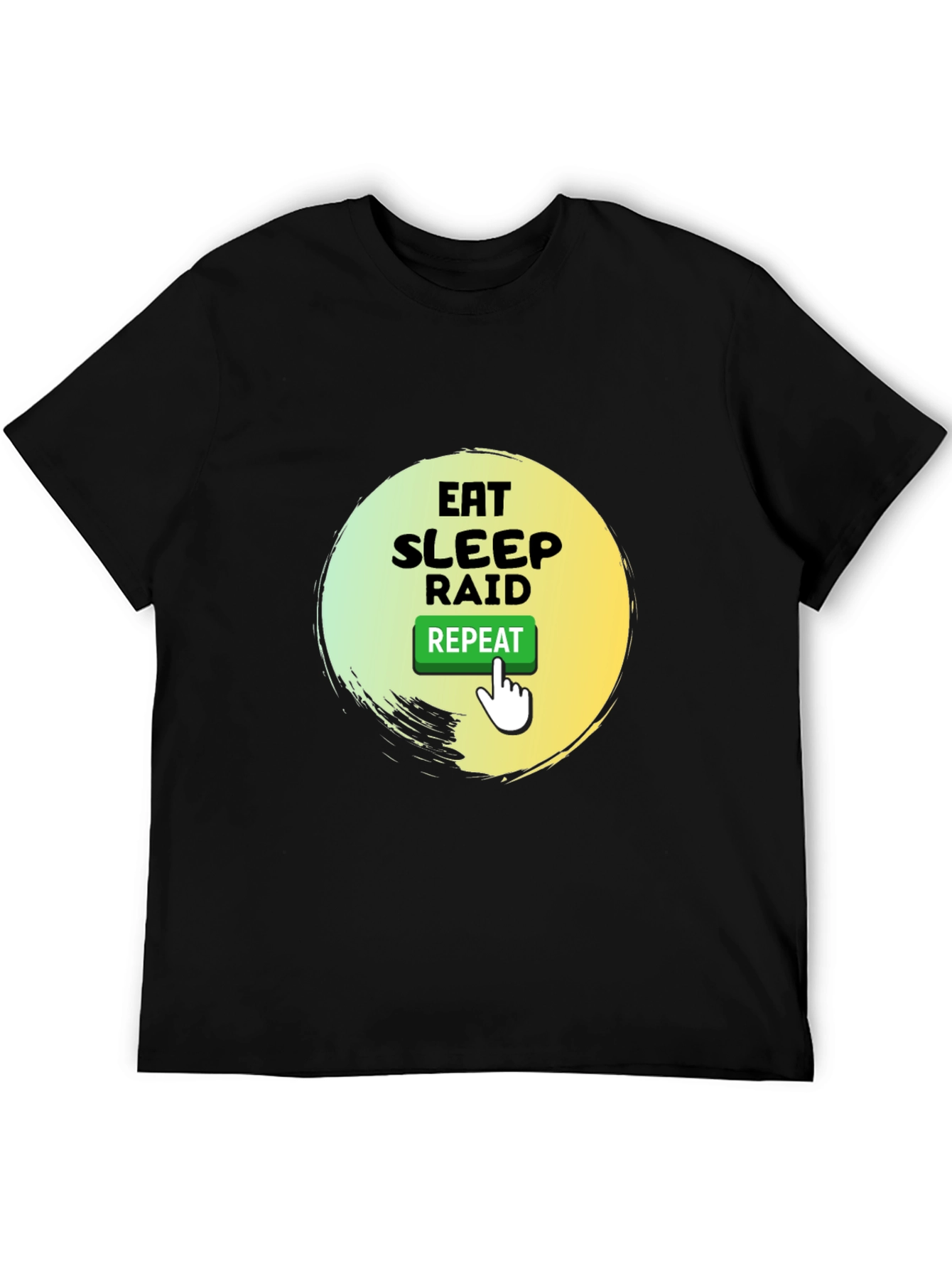 Show off your gaming lifestyle with this stylish black t-shirt featuring a unique "Eat Sleep Raid Repeat" design. The graphic includes vibrant green and yellow accents around the text. Made from a comfortable fabric, this tee is perfect for casual wear, gaming sessions, or hanging out with friends. The playful graphic and classic fit make it a great conversation starter and a must-have addition to any gamer's wardrobe. This t-shirt is not just apparel; it's a statement. Get yours today!