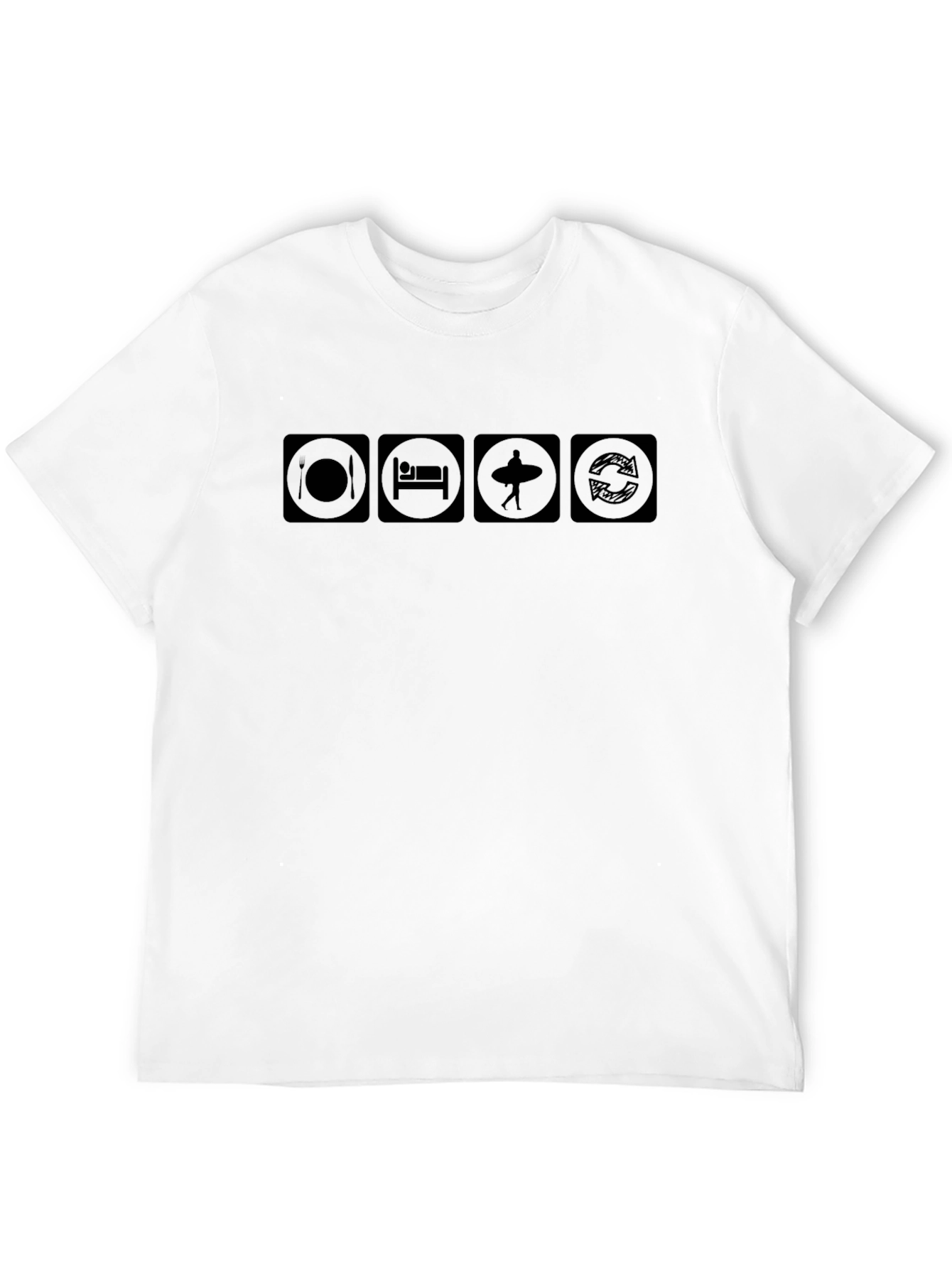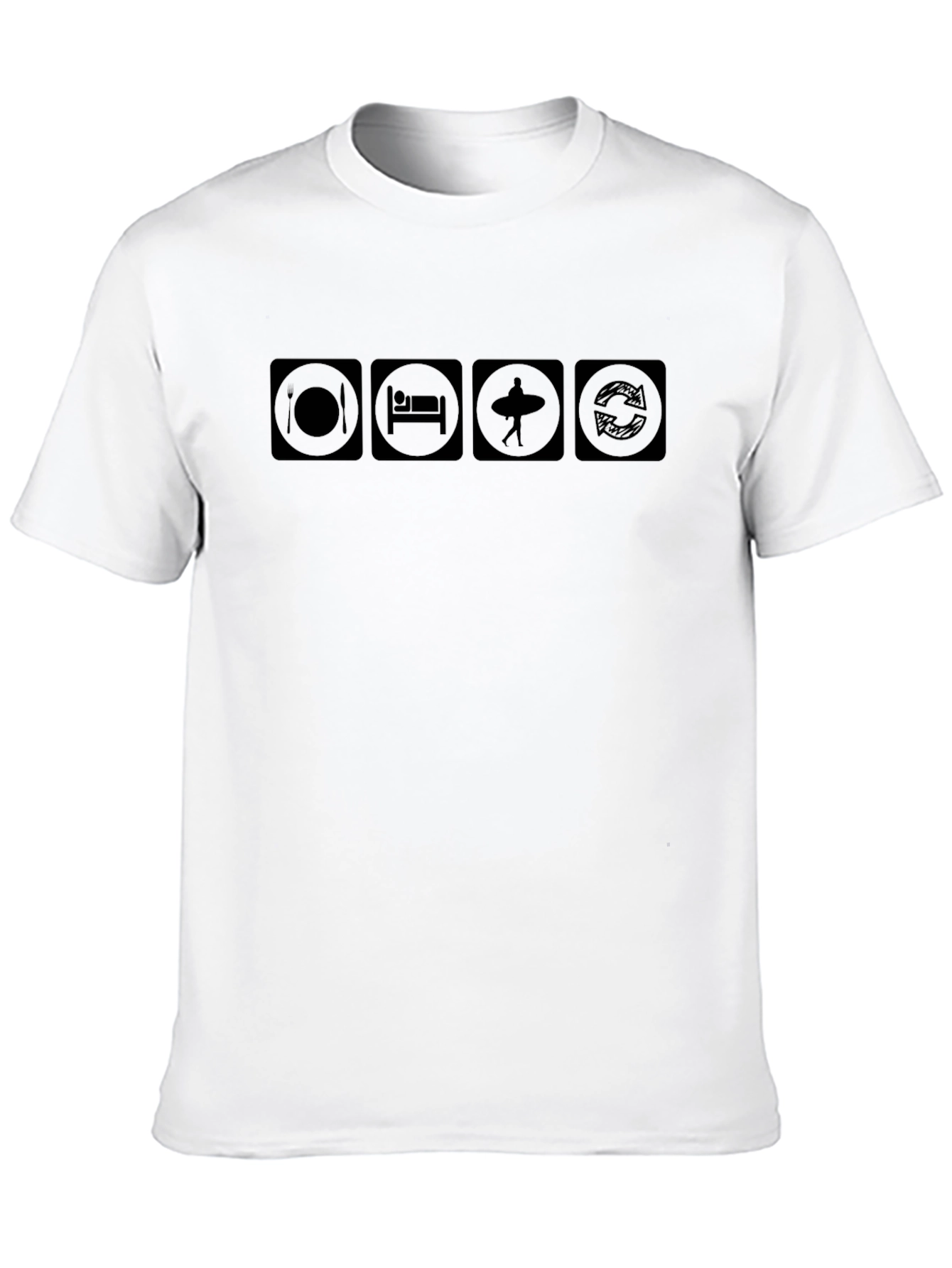 Show off your love for surfing with this stylish black t-shirt. The design features a clever graphic depicting the essential surfer's lifestyle: Eat, Sleep, Surf, Repeat. Made from a soft, breathable fabric, this tee offers a comfortable fit for everyday wear. The classic black color ensures it pairs well with any casual outfit. This shirt is perfect for surfers, beach lovers, or anyone who enjoys the laid-back vibe of surf culture. Wear it to the beach, while traveling, or simply when hanging out with friends. The unique design is sure to spark conversations and show off your passion for the surf lifestyle.