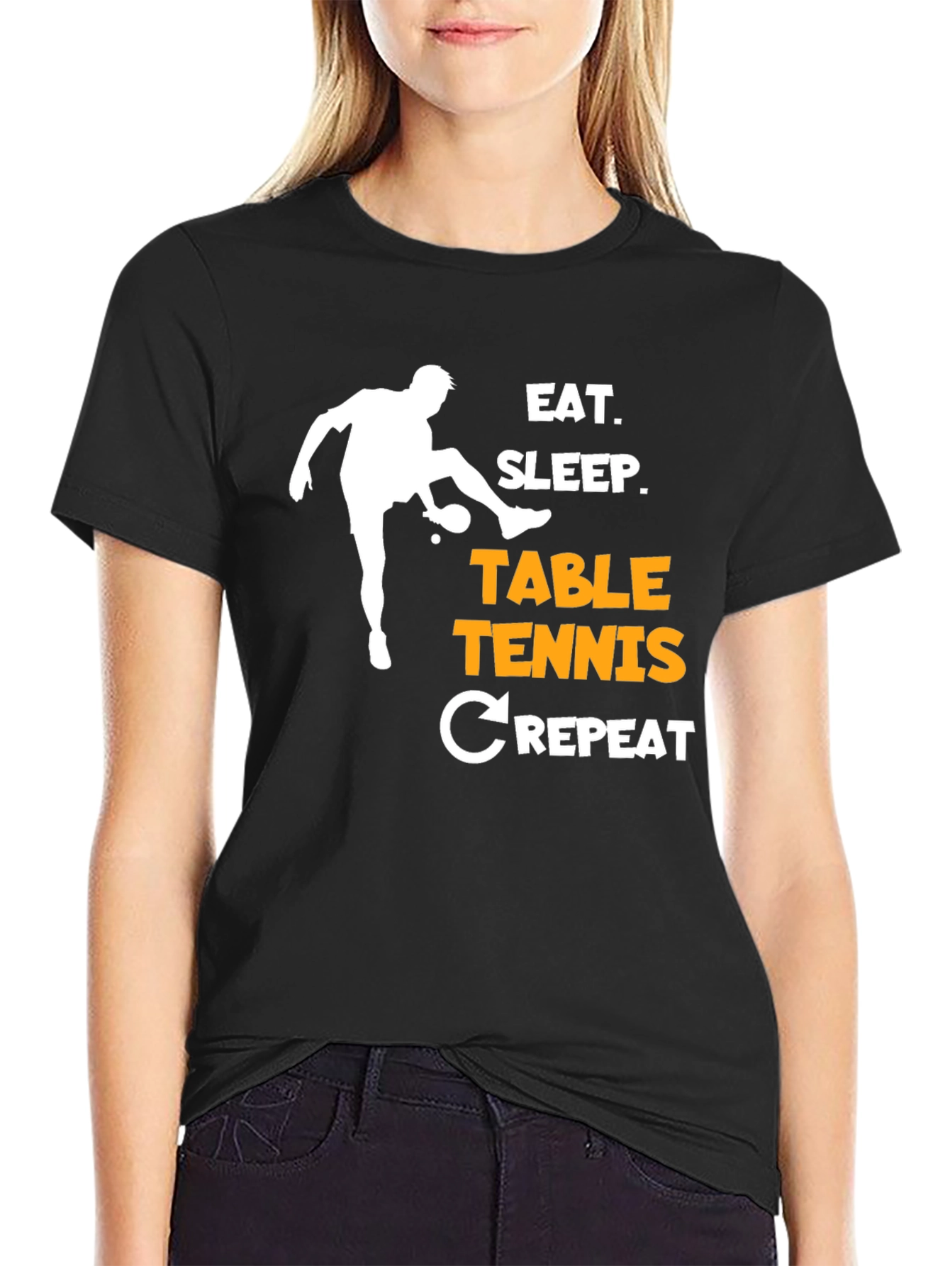 This stylish black t-shirt features a bold graphic design that celebrates the love for table tennis. The print showcases a silhouette of a player in action alongside the words "Eat. Sleep. Table Tennis. Repeat" in eye-catching white and orange lettering. Made from a soft, comfortable fabric, this shirt is perfect for everyday wear, whether you're hitting the tables or just relaxing with friends. Show off your passion for the game with this unique and trendy tee. It's a great conversation starter and a must-have for any table tennis enthusiast.