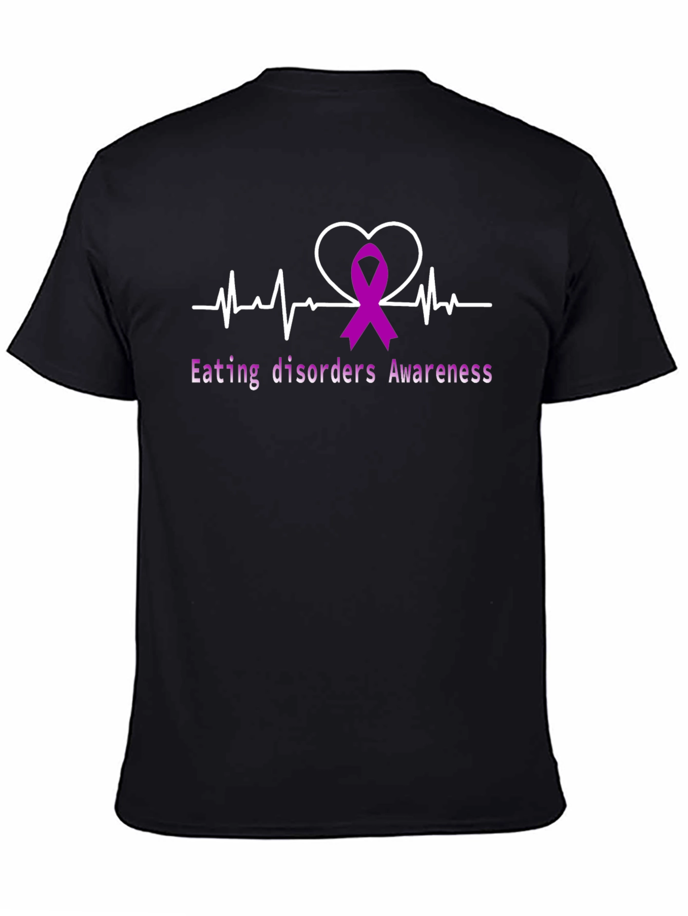 Show your support with this black Eating Disorders Awareness T-shirt. Features a white heartbeat design forming a heart with a purple ribbon in the center. Below reads Eating Disorders Awareness in matching purple font. Comfortable fabric for everyday wear. Ideal for awareness events, support groups, or showing solidarity. Spread the word and make a difference with this meaningful tee. A perfect way to show you care and contribute to the cause.