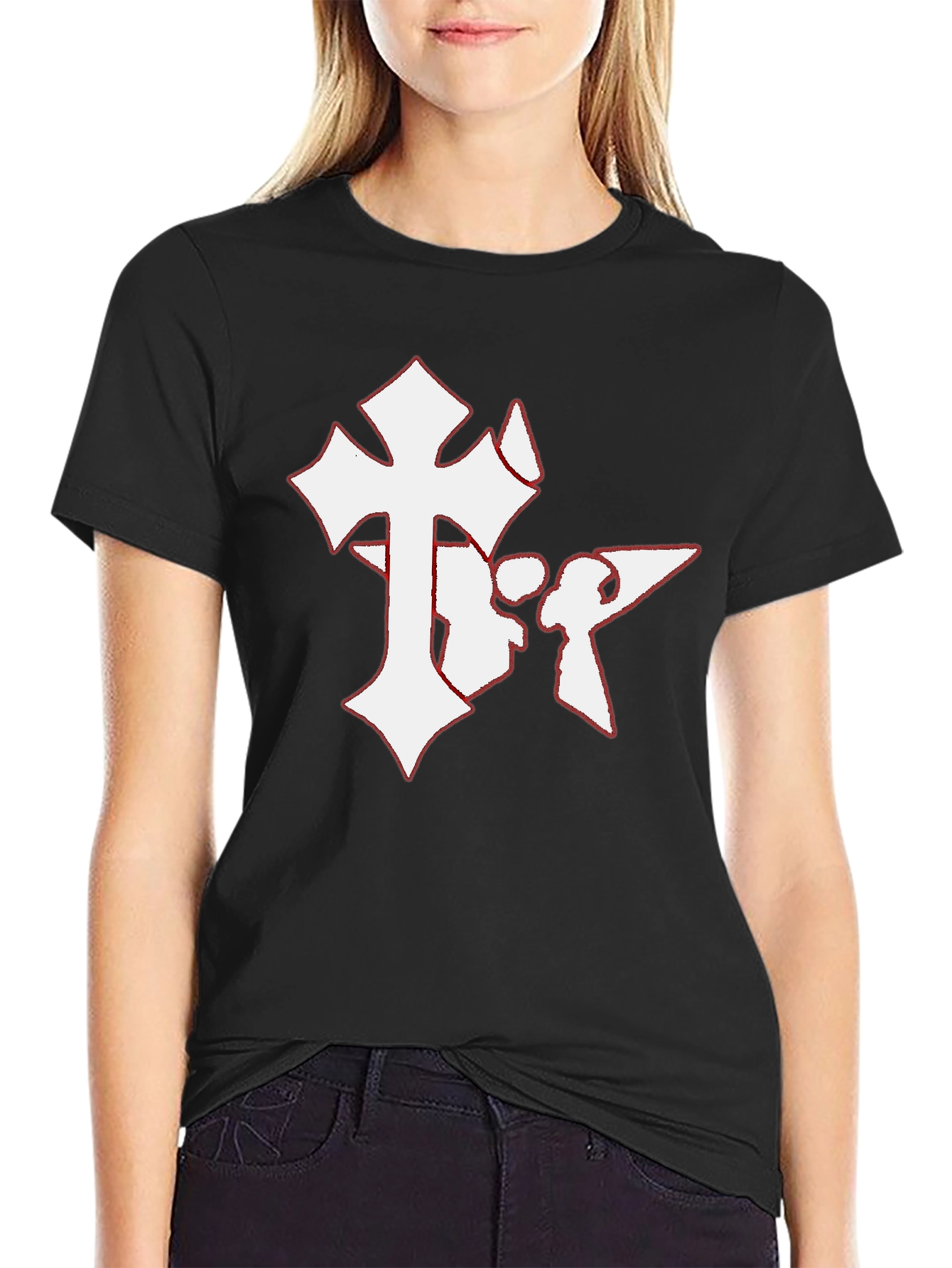 Make a bold statement with this striking black t-shirt. Featuring a distinctive white graphic print on the front, the design appears to be a stylized cross combined with unique, eye-catching shapes. The shirt is made from what appears to be a soft, comfortable cotton blend, ensuring both style and wearability. The classic crew neck and short sleeves make it versatile for casual wear. Perfect for expressing individuality, this t-shirt is ideal for concerts, casual hangouts, or everyday wear. Pair it with jeans or shorts for an effortlessly cool look. Add this unique piece to your wardrobe and stand out from the crowd.