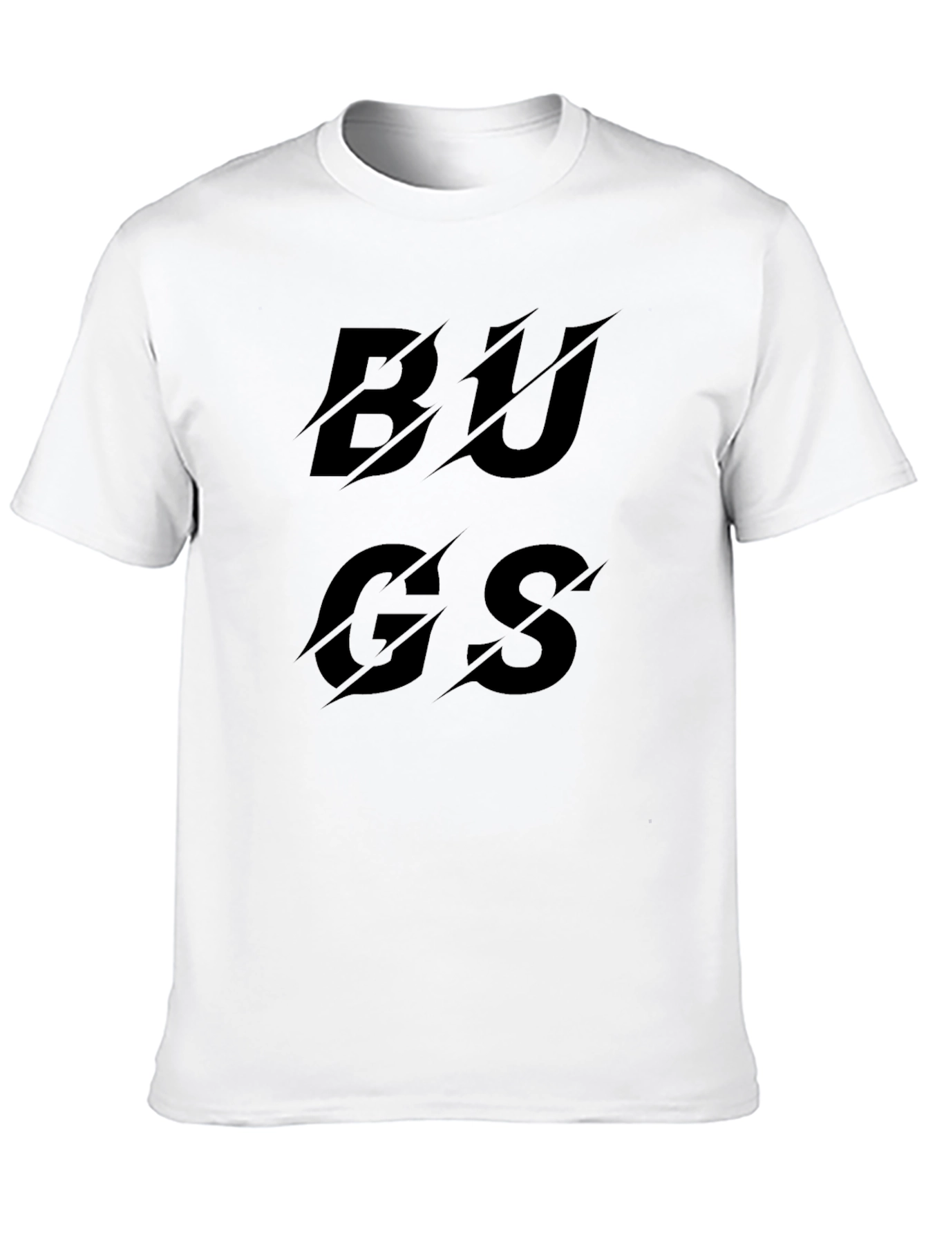 Make a bold statement with this black graphic t-shirt. The shirt features the word "BUGS" in a stylized font with claw mark accents, giving it a distinctive, edgy look. Made from what appears to be comfortable cotton material, this tee is perfect for casual wear. The design is eye-catching without being overly loud, making it versatile for different occasions. Wear it to a concert, out with friends, or simply while relaxing at home. The sleek black color ensures it pairs well with any bottoms. Upgrade your wardrobe with this unique tee that combines comfort and style.