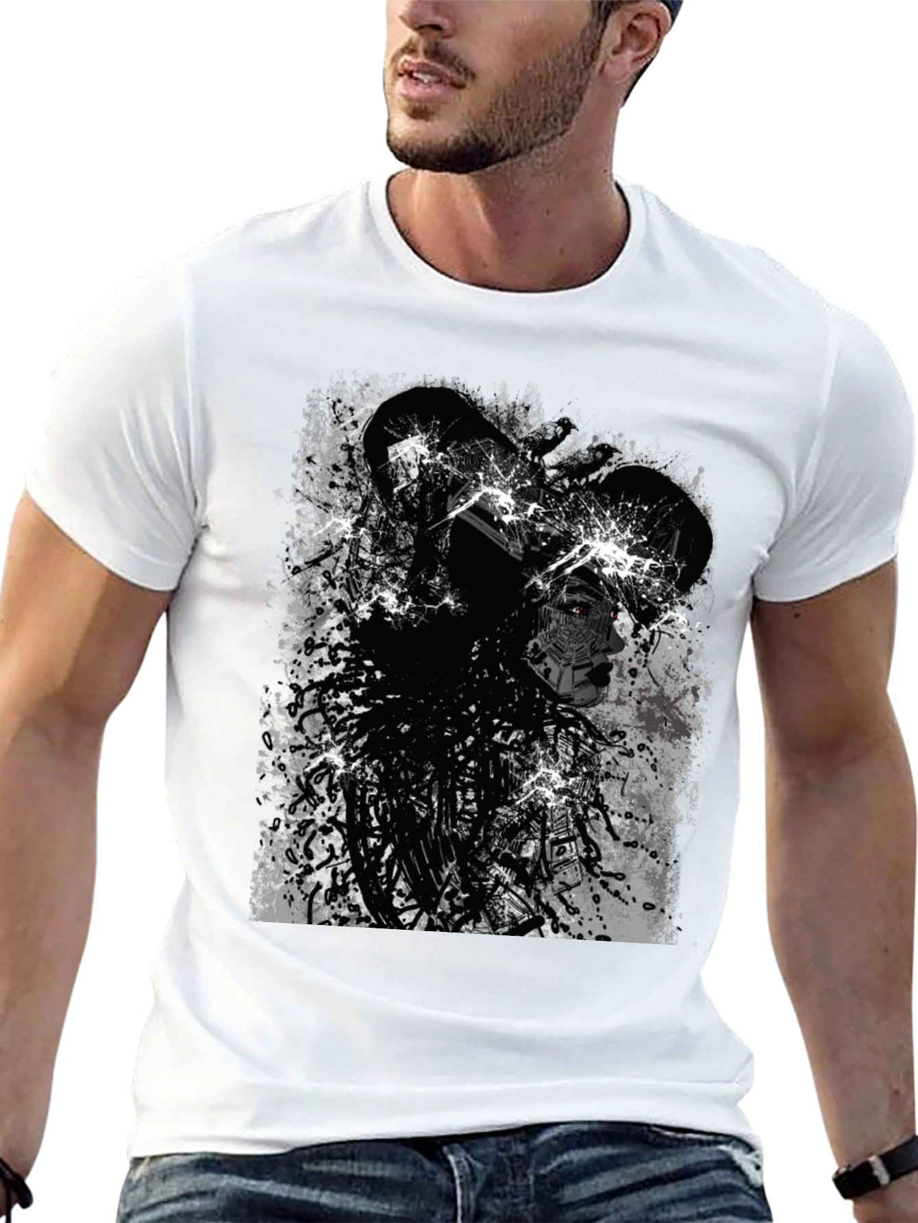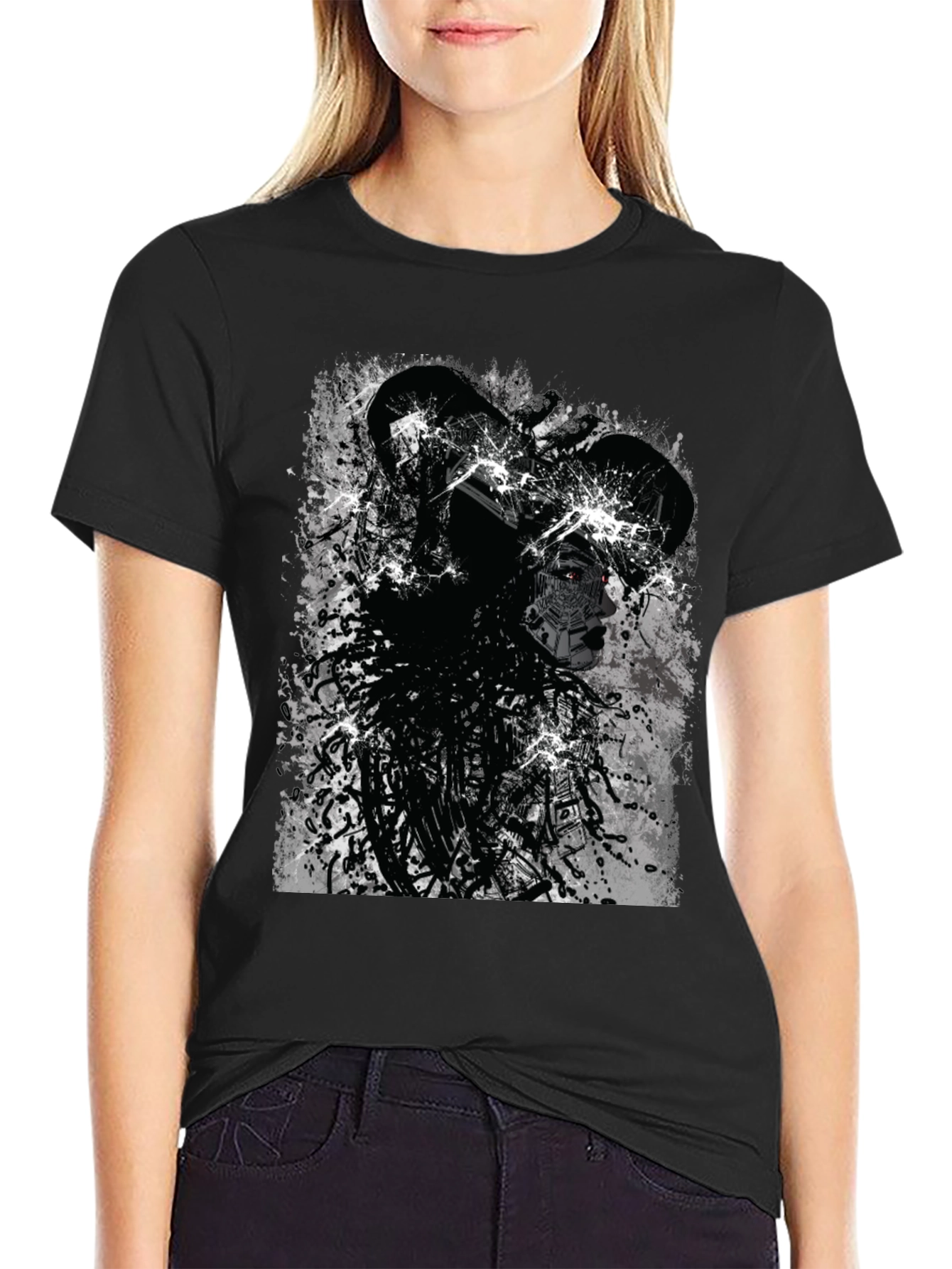 Unleash your inner rebel with this striking black graphic tee. The intricate design features a cyberpunk-inspired female figure emerging from a chaotic backdrop of splatters and geometric lines. The bold contrast of black and white creates a visually arresting piece, perfect for making a statement. Made from a soft, comfortable fabric, this tee is ideal for casual wear, concerts, or expressing your unique style. Pair it with jeans or shorts for an effortlessly cool look. Stand out from the crowd with this edgy, artistic tee.