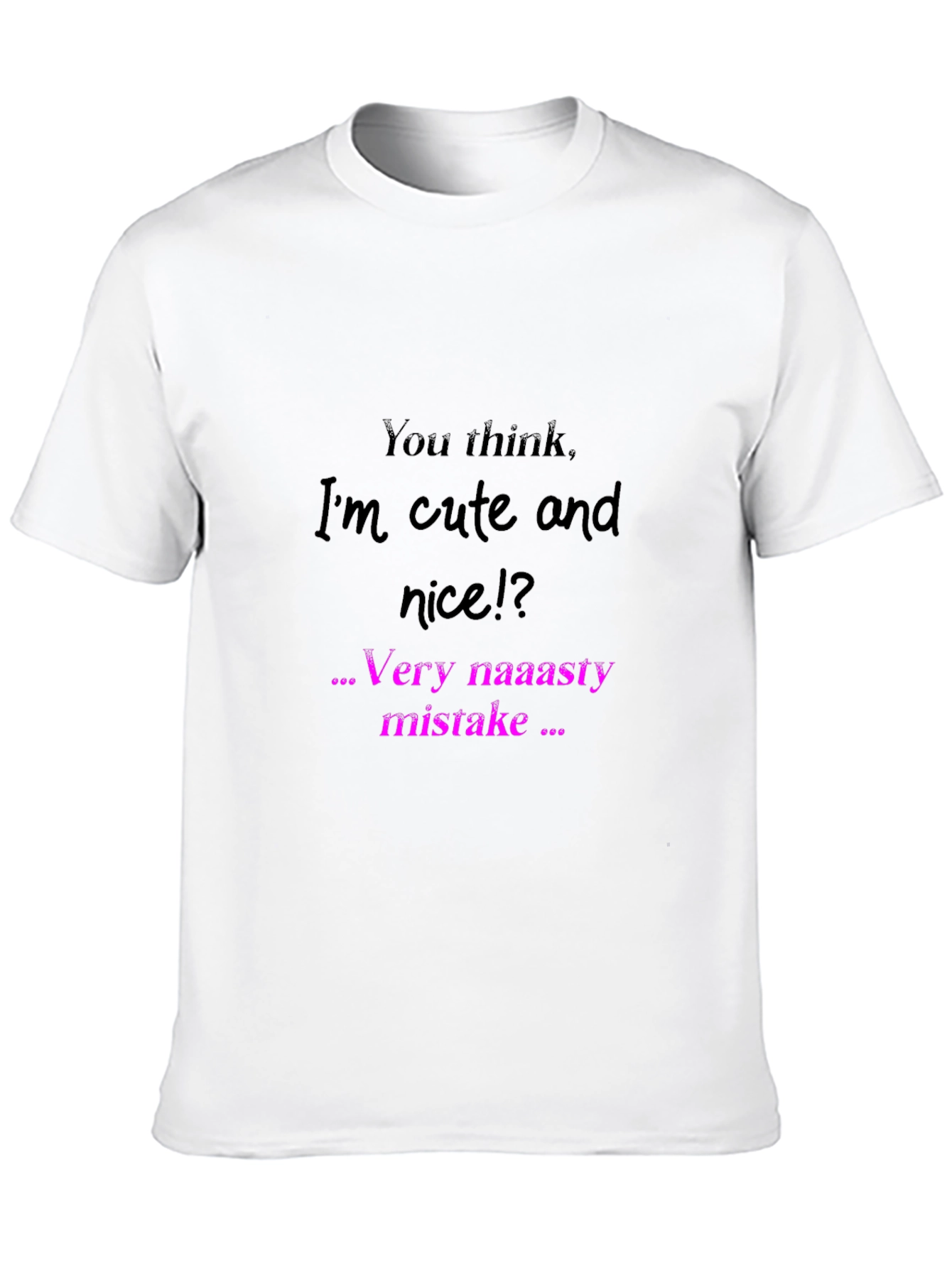 Make a statement with this eye-catching black t-shirt featuring a unique and edgy graphic design. The shirt displays the playful yet assertive message: "You think, I'm cute and nice!? ... Very naaasty mistake ..." printed in a contrasting font. The phrase "Very naaasty mistake" is in pink color, adding a pop of color and intrigue. Crafted from soft, breathable fabric, this tee offers both comfort and style. Perfect for casual wear, expressing your individuality, or making a bold impression. Stand out from the crowd and let your personality shine with this distinctive graphic tee.