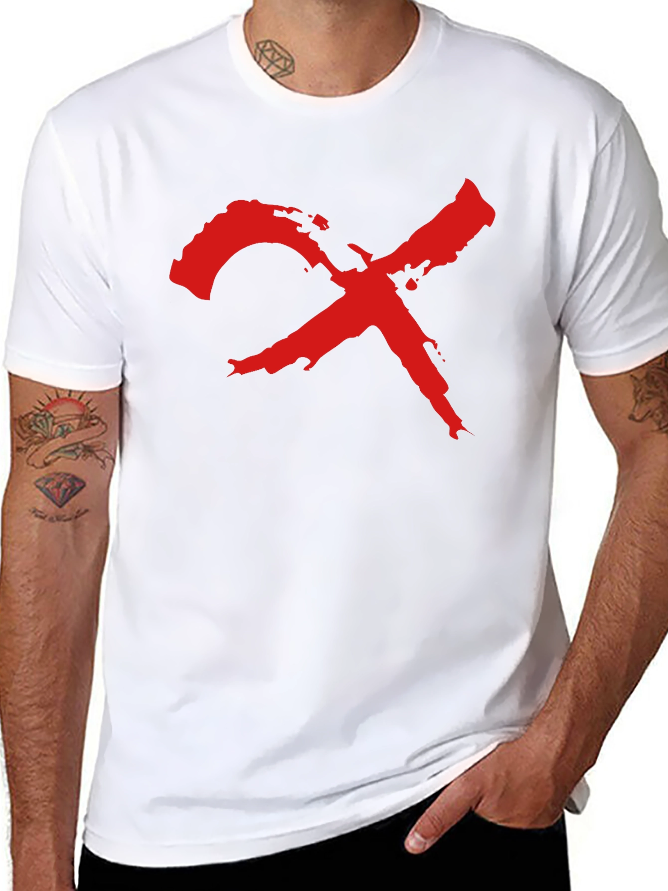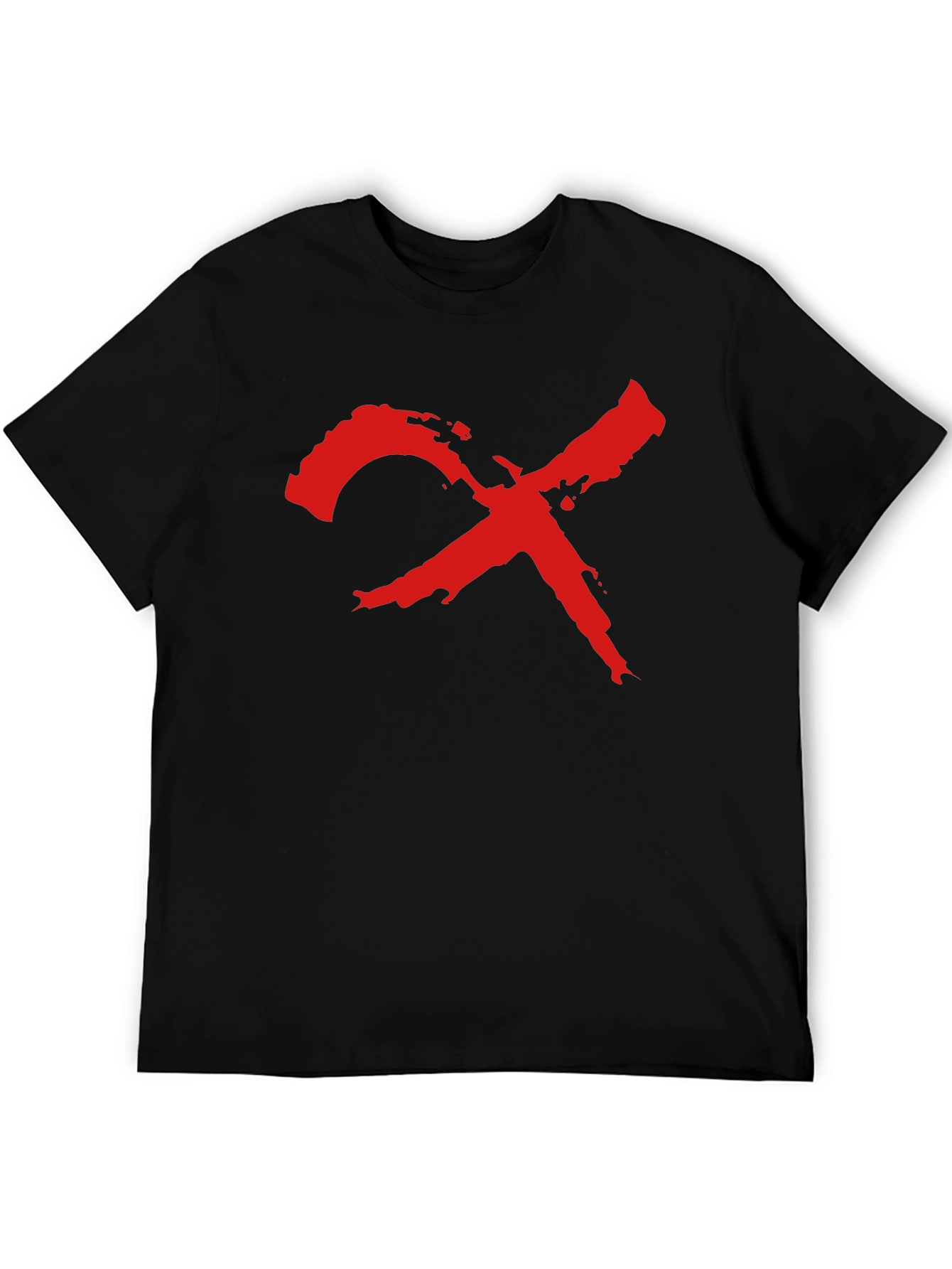 Make a bold statement with this striking black tee. Featuring a distressed-style, vibrant red "X" graphic emblazoned across the chest, this shirt exudes edgy style. The classic crew neck and short sleeves offer a comfortable and versatile fit. Crafted from what appears to be a soft and breathable cotton blend, this tee is perfect for everyday wear. Ideal for casual outings, concerts, or expressing your unique personality. Pair with jeans or shorts for a relaxed yet fashionable look. Add a touch of rebellious flair to your wardrobe with this eye-catching graphic tee.